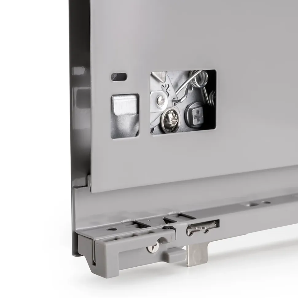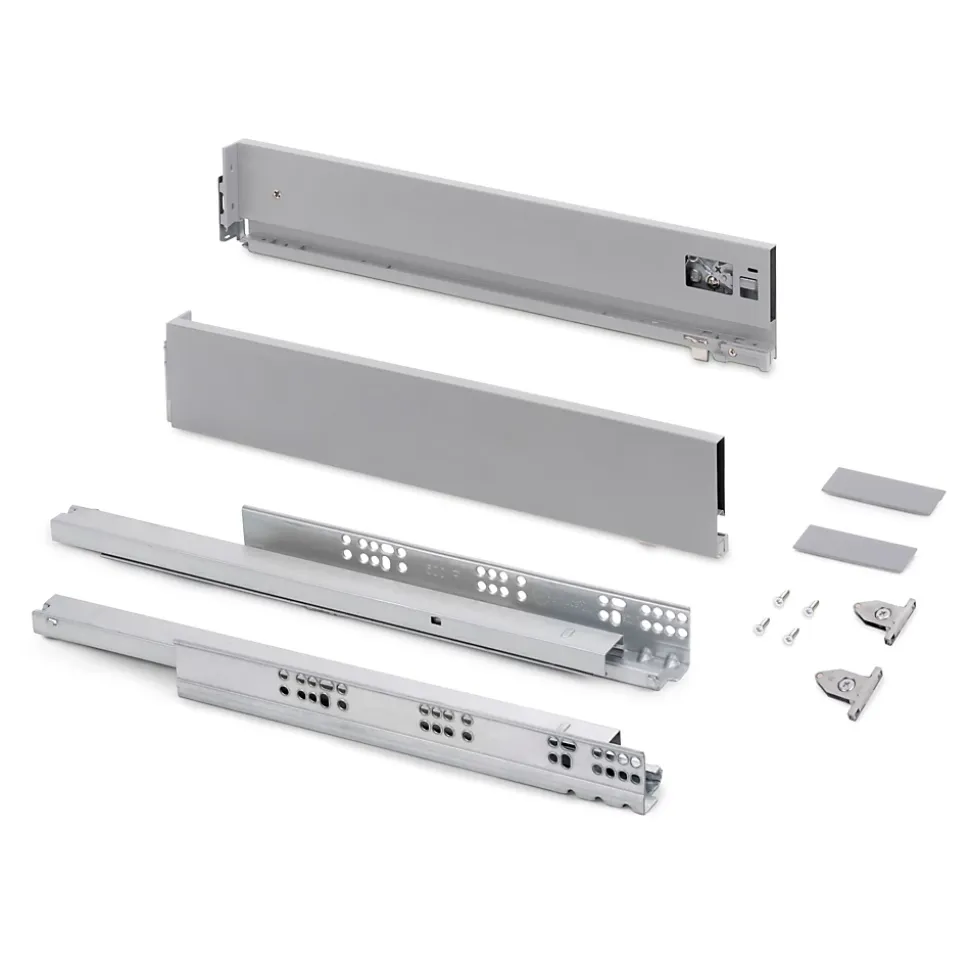 Kit de ferrures nécessaires pour le montage d’un tiroir extérieur de hauteur 93 mm et profondeur 400 mm, n’incluant pas le fond, la façade ni la façade arrière.Dimensionnées pour une épaisseur de panneau de 16 mm pour le fond et l’arrière du tiroir.Coulisses à sortie totale synchronisés, avec fermeture amortie et charge jusqu’à 40 kg.U dispose d’un réglage frontal en 3D : vertical au moyen d’un excentrique de ±2 mm, horizontal ±1 mm, inclinaison -1,5/+4 mm.Fabriquées en acier peint en aluminium. VOIR LES MESURES DU PRODUIT DANS LES IMAGES. Kit pour tiroir de cuisine et salle de bain Vertex avec tous les éléments nécessaires à son montage. C’est la solution optimale pour vos meubles de cuisine, de salle de bain ou d’armoire avec un design élégant. Chaque kit est composé de tous les éléments nécessaires au montage d’un tiroir extérieur de hauteur 93mm, dimensionnées pour une épaisseur de panneau de 16mm pour le fond et l’arrière du tiroir. Comprend: deux côtés latérales, un ensemble de guides à fermeture amortie, un ensemble de couvre-garnitures et des attaches avant de tiroir.Les côtés latérales métalliques sont en acier avec finition peinte en gris anthracite, permettent d’un réglage frontal en 3D : vertical au moyen d’un excentrique de ±2 mm, horizontal ±1 mm, inclinaison -1,5/+4 mm. Les guides sont à sortie totale avec fermeture amortie et permettent une charge maximale de 40 Kg pour le tiroir.Vous n’aurez qu’à ajouter les panneaux pour le fond, la façade arrière et la façade du tiroir, avec les dimensions correctes.