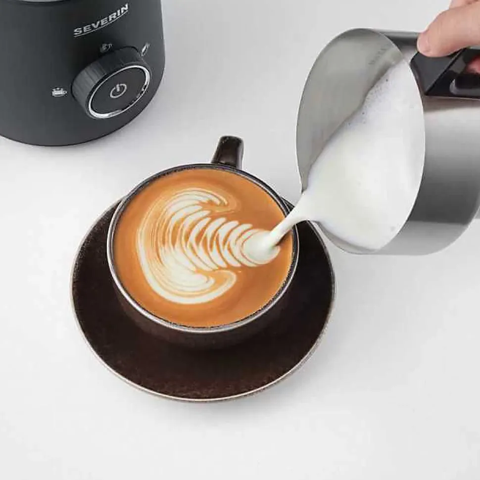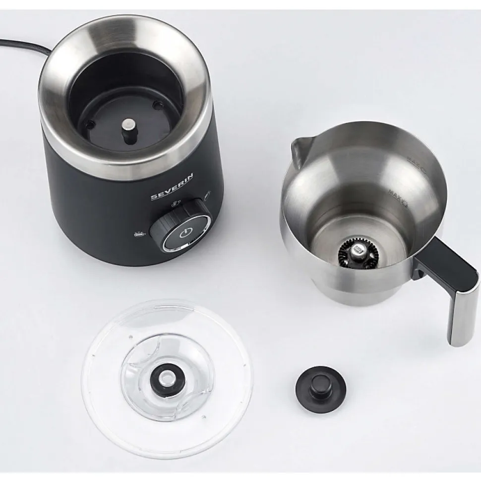 Emulsionneur de lait 500w 0.5l inox/noir Severin – Emulsionneur de lait/Chocolatière Spuma 500 Severin SM3585 simple et pratique pour un mousse de lait succulente. Easy-Select : bouton de commande rotatif pour sélectionner le programme souhaité : mousse à froid, mousse à chaud ou lait chaud, et chocolat chaud. Anneau lumineux LED (rouge/chaud ou bleu/froid) autour de l’appareil. Il indique si un programme chaud ou froid est sélectionné. Bec verseur fin : idéal pour réaliser des motifs de Latte Art. Ouverture dans le couvercle pour l’ajout progressif d’ingrédients pendant la préparation. – Type de produit : Emulsionneur de lait.Puissance : 500 W.Capacité : 50 cL.Couleur : Inox brossé noir mat.Sécurité contre la surchauffe.Arrêt automatique après deux minutes de non-utilisation.Rangement du cordon d’alimentation.Capacité du pot XXL : pour env. 120 – 260 ml de mousse ou env. 120 – 500 ml de lait chaud.Nettoyage facile lavable au lave-vaisselle.Accessoires interchangeables pour chauffer ou mousser.Dimensions (hxlxp) 23,6 x 19,5 x 15,5 cm.Poids : 1,60 kg.
