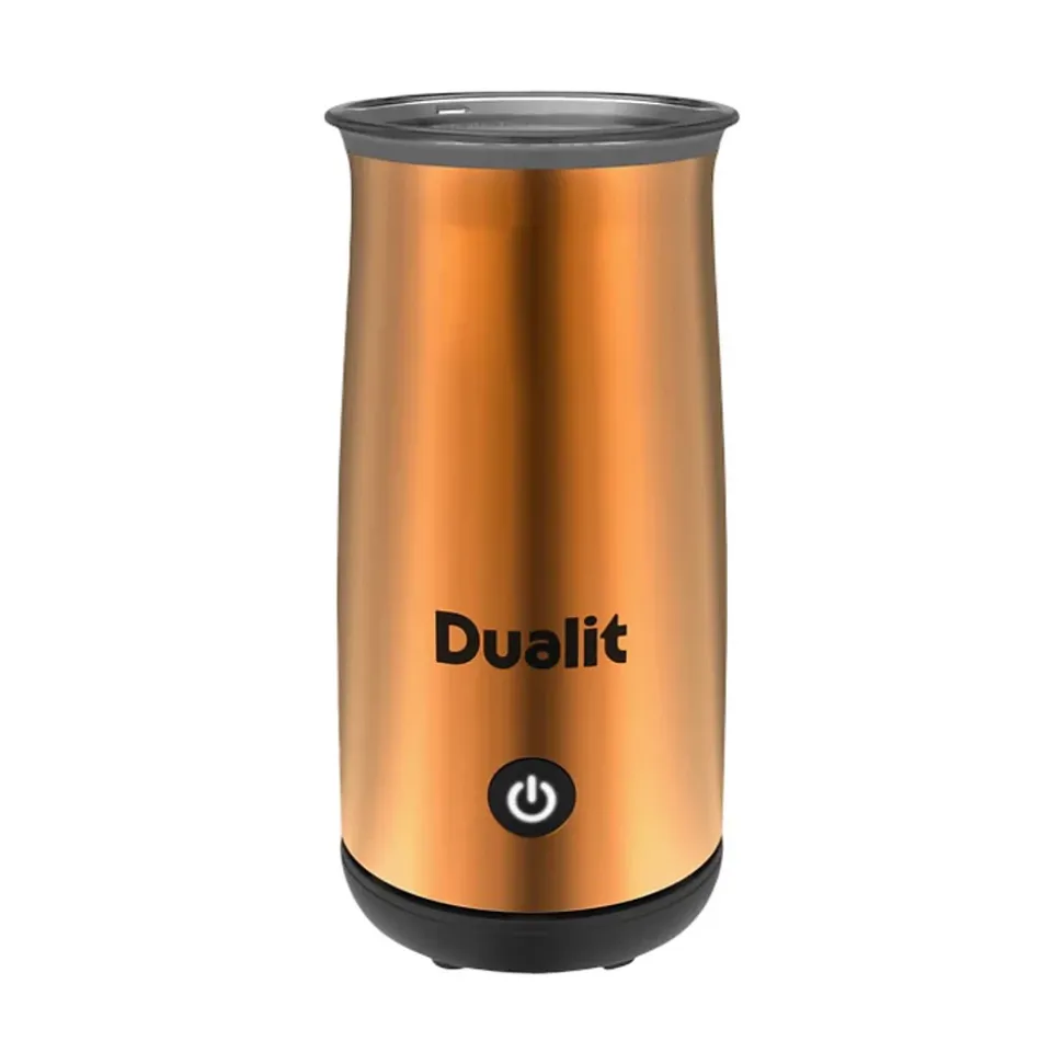 Emulsionneur de lait et chocolatière 250ml cuivre Dualit – Emultionneur de lait 84149 de Dualit.Mousseur à lait portatif et machine à chocolat chaud : Créez des boissons dignes d’un barista chez vous en quelques minutes grâce au nouveau mousseur à lait portable Dualit. Idéal pour préparer un flat white, un cappuccino, un latte, un moka, un milkshake ou un chocolat chaud gourmand, sans avoir à vous déplacer dans un café. Une gamme d’accessoires uniques garantit une mousse de lait parfaitement texturée pour une variété de boissons, dont le flat white tendance.Un chocolat chaud décadent à la maison tous les jours : Pas besoin de préparer ou d’acheter une marque spéciale , il suffit de casser quelques carrés de votre chocolat préféré et de les ajouter au mousseur pour un chocolat chaud onctueux et onctueux. Ce chocolat fonctionne aussi bien avec des copeaux, des pépites ou de la poudre de chocolat. Amusez-vous à expérimenter différentes saveurs selon votre humeur.Technologie de nettoyage facile : Le système breveté de protection anti-débordement du moteur empêche le lait de brûler dans le pot, et l’intérieur lisse et antiadhésif garantit un nettoyage rapide. Un simple rinçage et un essuyage suffisent pour préparer votre prochaine tasse. Les accessoires passent au lave-vaisselle (uniquement sur le panier supérieur).Simple à utiliser : Le mousseur à lait portatif est facile à utiliser grâce à sa simple pression sur une touche. Il s’éteint automatiquement lorsqu’il atteint la température idéale. Pour un milkshake bien frais, ajoutez des glaçons dans votre verre, versez le liquide et savourez ! – Type de produit : Emultionneur de lait.Capacité : total : 250ml.Puissance : 500 W.Récipient intérieur en acier inoxydable.Dimensions : (L) 10 x (H) 20,5 x (P) 10 cm.Couleur : Cuivre.Poids : 0.85 kg.