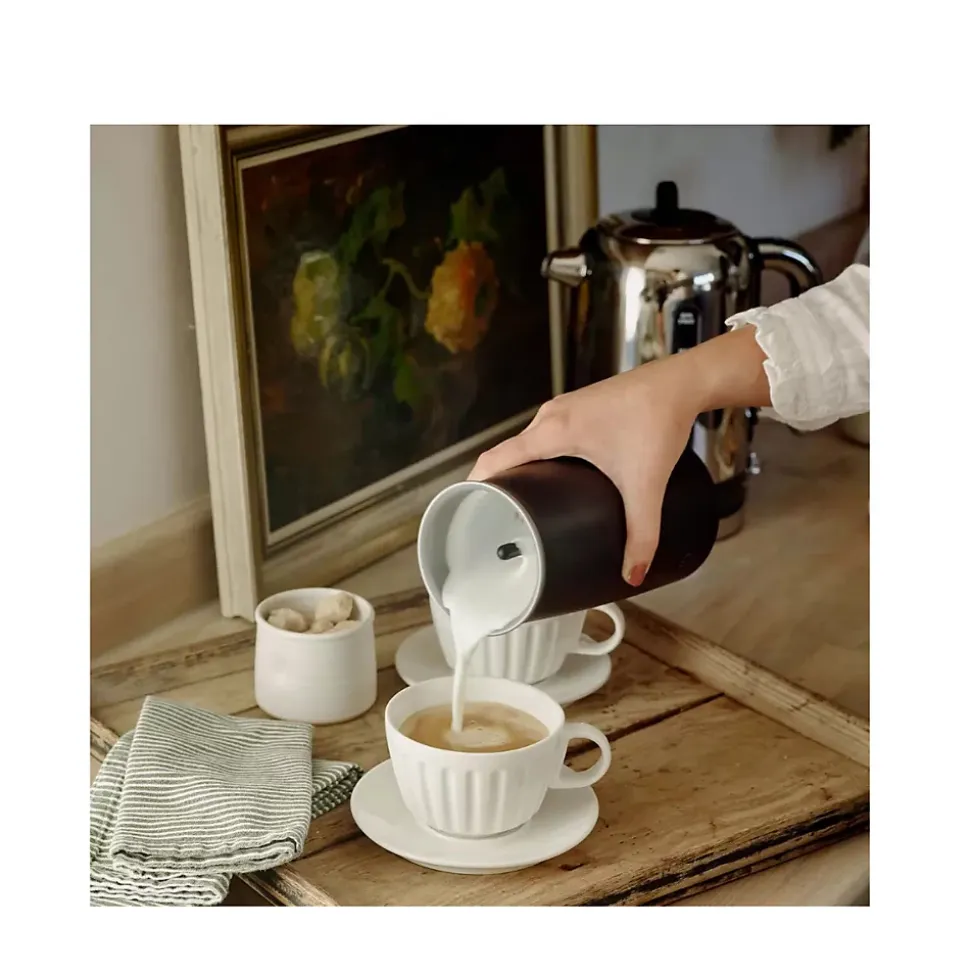 Emulsionneur de lait et chocolatière 250ml noir Dualit – Emultionneur de lait 84146 de Dualit.Mousseur à lait portatif et machine à chocolat chaud : Créez des boissons dignes d’un barista chez vous en quelques minutes grâce au nouveau mousseur à lait portable Dualit. Idéal pour préparer un flat white, un cappuccino, un latte, un moka, un milkshake ou un chocolat chaud gourmand, sans avoir à vous déplacer dans un café. Une gamme d’accessoires uniques garantit une mousse de lait parfaitement texturée pour une variété de boissons, dont le flat white tendance.Un chocolat chaud décadent à la maison tous les jours : Pas besoin de préparer ou d’acheter une marque spéciale , il suffit de casser quelques carrés de votre chocolat préféré et de les ajouter au mousseur pour un chocolat chaud onctueux et onctueux. Ce chocolat fonctionne aussi bien avec des copeaux, des pépites ou de la poudre de chocolat. Amusez-vous à expérimenter différentes saveurs selon votre humeur.Technologie de nettoyage facile : Le système breveté de protection anti-débordement du moteur empêche le lait de brûler dans le pot, et l’intérieur lisse et antiadhésif garantit un nettoyage rapide. Un simple rinçage et un essuyage suffisent pour préparer votre prochaine tasse. Les accessoires passent au lave-vaisselle (uniquement sur le panier supérieur).Simple à utiliser : Le mousseur à lait portatif est facile à utiliser grâce à sa simple pression sur une touche. Il s’éteint automatiquement lorsqu’il atteint la température idéale. Pour un milkshake bien frais, ajoutez des glaçons dans votre verre, versez le liquide et savourez ! – Type de produit : Emultionneur de lait.Capacité : total : 250ml.Puissance : 500 W.Récipient intérieur en acier inoxydable.Dimensions : (L) 10 x (H) 20,5 x (P) 10 cm.Couleur : Noir.Poids : 0.8 kg.