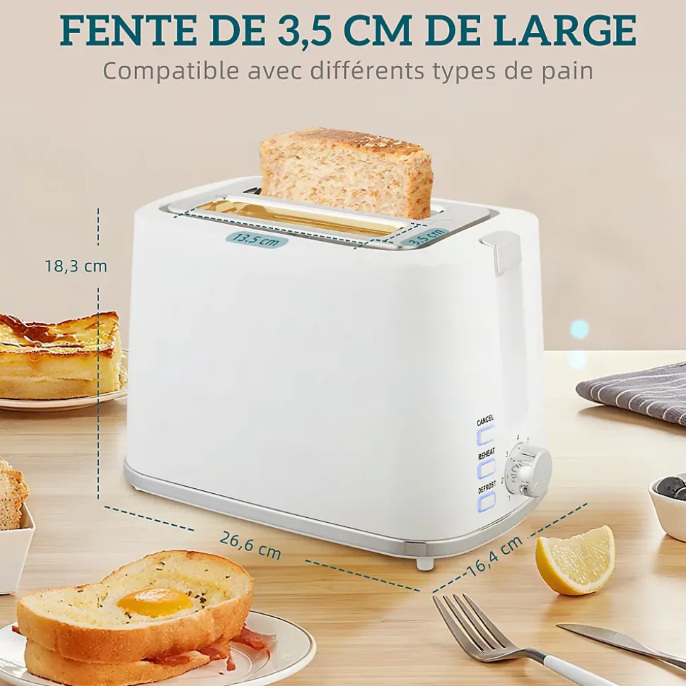 Démarrez vos journées avec l’ensemble bouilloire et grille-pain HOMCOM, comprenant une bouilloire de 1,7L avec thermostat Otter et un grille-pain à deux fentes. La bouilloire rapide et sûre possède des fonctions d’arrêt automatique et de protection contre la surchauffe. Le grille-pain blanc propose sept niveaux de dorage, parfait pour tout type de pain. Cet ensemble élégant optimise et embellit votre routine matinale.Caractéristiques :- Ensemble de bouilloire et grille-pain rehausse votre cuisine avec un style moderne- Fait bouillir l’eau en quelques minutes avec une puissance de 2200W, convient aux matins chargés- Capacité généreuse de 1,7L pour répondre aux besoins de la famille, avec une fenêtre d’eau pratique- Profitez d’un toast optimal avec 7 niveaux de brunissage et des boutons de fonction faciles à utiliser- Arrêt automatique, protection contre l’ébullition à sec et la surchauffe garantissent une utilisation sûre et sans souci- Base de la bouilloire électrique à 360° avec rangement intégré pour le cordon maintient votre espace de cuisine ordonné- Bac à miettes amovible et filtre anticalcaire pour un nettoyage facileSpécifications :- Couleurs : blanc, argent- Matériaux : PP, acier- Dim. bouilloire : 22,2L x 16,7l x 23,2H cm- Dim. grille-pain : 26,6L x 16,4l x 18,3H cm- Dim. base de la bouilloire : Ø 15,6 x 1,5H cm- Dim. fente du grille-pain : 13,5L x 3,5l x 13,5H cm- Capacité de la bouilloire : 1,7 l- Puissance de la bouilloire : 1850-2200 W- Puissance du grille-pain : 920-1080 W- Tension : 220-240 V, 50/60 Hz- Longueur du câble : 0,7 m- Réf. : 800-283V90WT