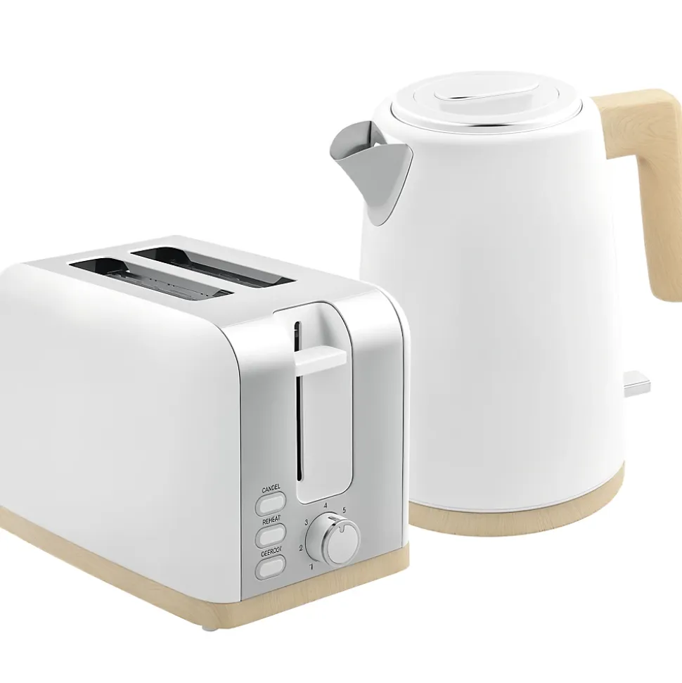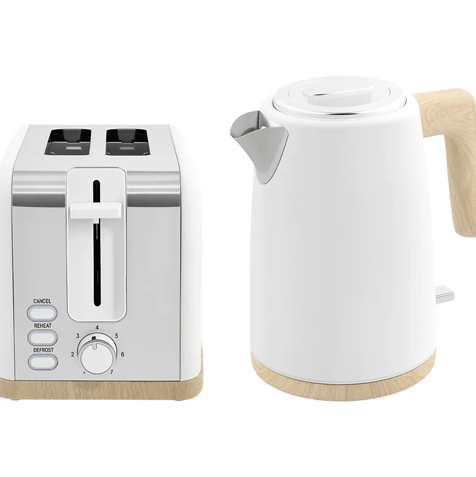 Apportez une touche d’élégance à votre cuisine avec l’ensemble bouilloire et grille-pain blanc HOMCOM. Leur finition mate et l’effet bois moderne subliment votre espace. Le grille-pain offre 7 niveaux de dorage, réchauffage et dégivrage, avec des bagues lumineuses.Caractéristiques :- Bouilloire inox de 1,7L pour servir facilement 6-8 tasses- Grille pain blanc avec fonctions réchauffage, décongélation et annulation pour plus de polyvalence- Design à levée haute pour retirer facilement les petites tranches- 7 niveaux de brunissage pour un toast parfait à chaque fois- Arrêt automatique sur les deux appareils, fabriqués sans BPA pour votre sécurité. Protection contre l’ébullition à sec pour la bouilloire- Rangement intégré du cordon pour un plan de travail toujours propre- Filtre amovible de la bouilloire électrique inox pour un nettoyage rapide et facileSpécifications :- Couleur : blanc, ton argent, effet bois- Matériau : PP, acier inoxydable- Dimensions de la bouilloire : 22,4L x 15,6l x 23,9H cm (avec base)- Capacité de la bouilloire : 1,7 L (max.), 500 ml (min.)- Dimensions du grille-pain : 26,4L x 17,3l x 18,9H cm- Dimensions de chaque fente : 13,5L x 3,5l x 13,5H cm- Tension : 220-240V, 50/60Hz- Puissance : 1850-2200W (bouilloire), 780-930W (grille-pain)- Longueur du câble : 0,7m (bouilloire, grille-pain)- Réf. : 800-234V90WT