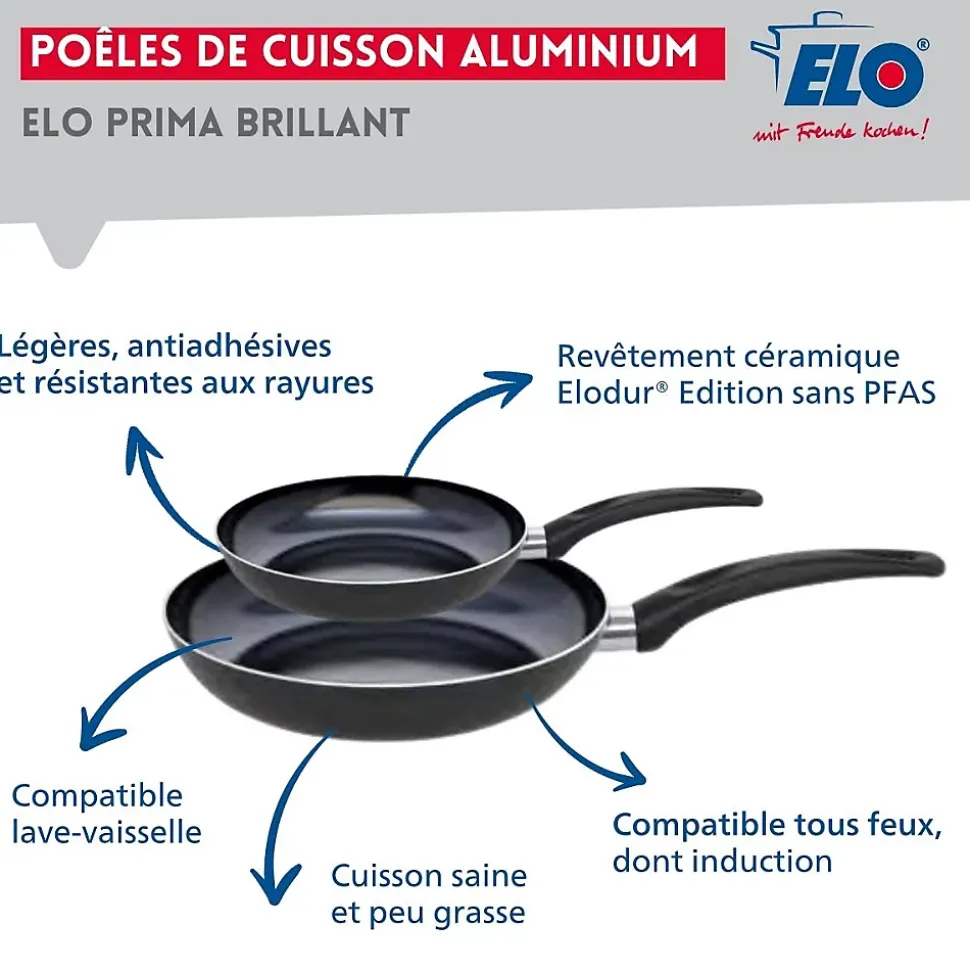 Découvrez l’ensemble de 2 poêles de cuisson et 2 faitouts Elo Prima Brillant, parfait pour répondre à tous vos besoins culinaires. Composé de poêles de 24 et 32 cm en aluminium, cet ensemble se distingue par son revêtement en céramique sans PFAS, offrant une surface ultra résistante et anti-adhésive. Préparez des plats savoureux sans craindre que les aliments n’adhèrent, tout en assurant une cuisson homogène. Les faitouts de 16 et 20 cm, en inox robuste, sont idéaux pour mijoter, cuire à la vapeur ou réaliser de délicieuses soupes. Leur design élégant en fait un atout pour votre cuisine, tout en garantissant une répartition optimale de la chaleur. Sans revêtement, ces faitouts sont parfaits pour les cuissons longues et permettent de conserver la qualité des aliments.Compatible avec tous les types de feux, y compris l’induction, cet ensemble est polyvalent et adapté à tous les foyers. Faciles à nettoyer, les poêles et faitouts sont conçus pour un usage quotidien, alliant praticité et performance. Avec l’ensemble Elo Prima Brillant, cuisinez avec confiance et créativité tout en profitant de la robustesse et de l’efficacité de chaque pièce. Transformez vos repas en moments de partage inoubliables grâce à cet ensemble de cuisine de qualité supérieure.