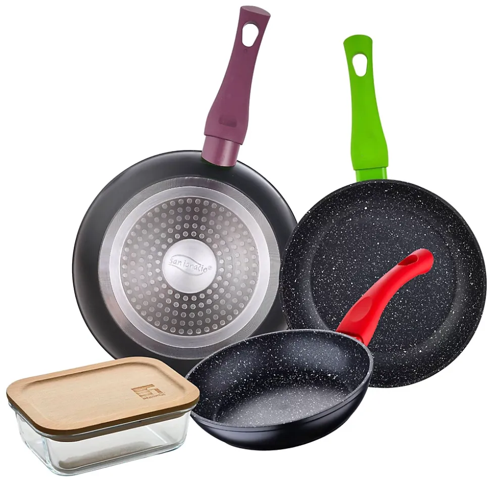 Ensemble de 3 poêles à frire San Ignacio Collection Jolie en aluminium forgé.Poêle de 18 cm de diamètre.Poêle de 22 cm de diamètre.Poêle de 26 cm de diamètre.Poignées ergonomiques de couleurs différentes.Revêtement antiadhésif marbré.Compatible avec tous types de feux, y compris l’induction.Récipient en verre de 650 ml avec couvercle en bambou et joint en silicone.