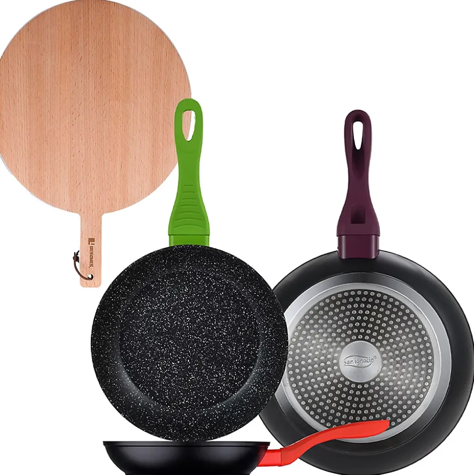 Ensemble de 3 poêles à frire San Ignacio Collection Jolie en aluminium forgé.Poêle à frire Ø 20 x 4,2 cmPoêle à frire Ø 24 x 5 cmPoêle à frire Ø 28 x 5,8 cmPoignées ergonomiques de couleurs différentes.Revêtement antiadhésif marbré.Compatible avec tous types de feux, y compris l’induction.Planche à découper en hêtre 38 x 28 x 1,5 cm