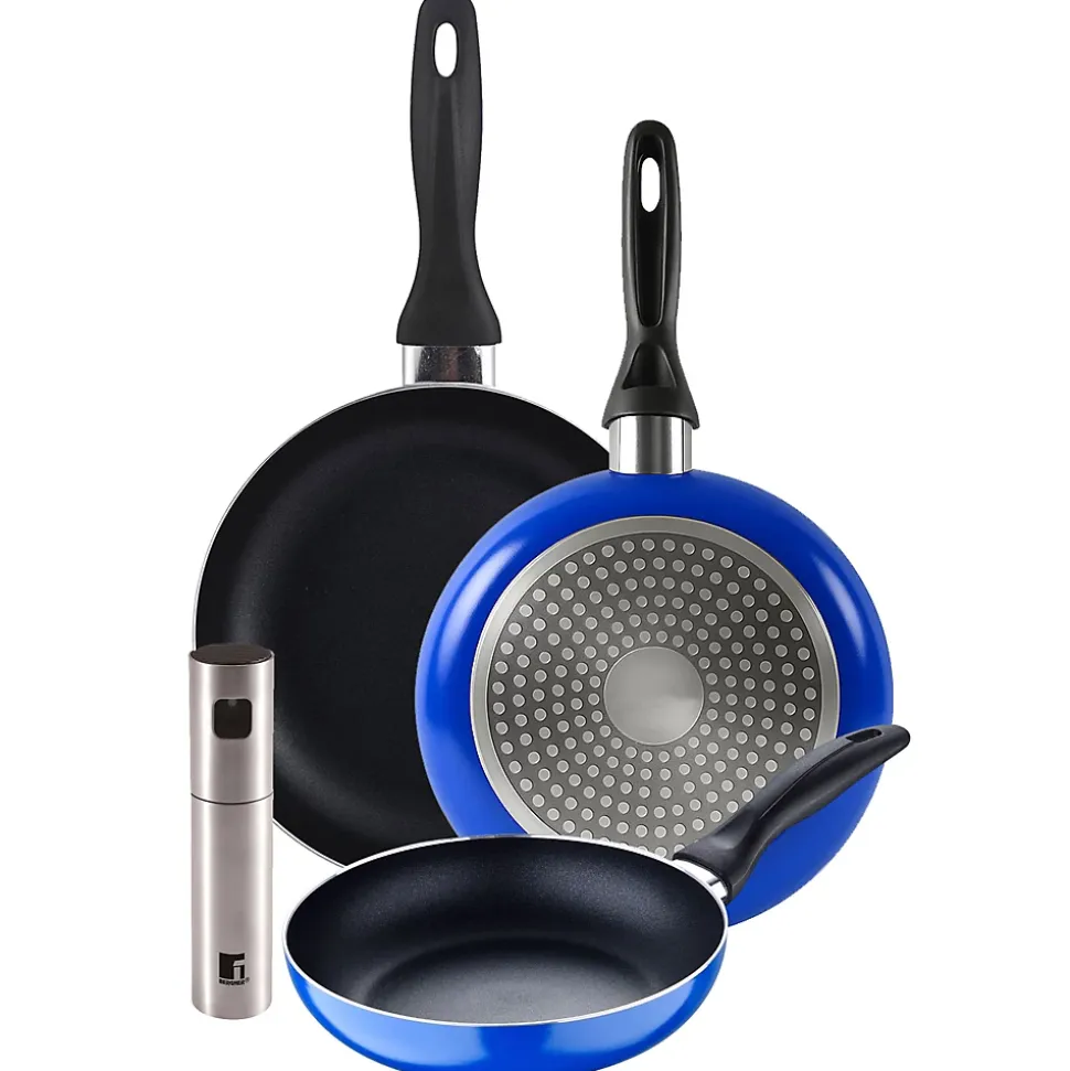 Ensemble de 3 poêles San Ignacio Navy Paradise en aluminium pressé.Poêle Ø16 x 3,5 cmPoêle Ø20 x 4,5 cmPoêle Ø24 x 4,5 cmPoignées ergonomiques en thermoplastique.Revêtement antiadhésif et fond diffuseur intégré.Compatible avec tous types de feux, y compris l’induction.Couleur bleue. Flacon vaporisateur d’huile et de vinaigre en verre et acier de 100 ml.