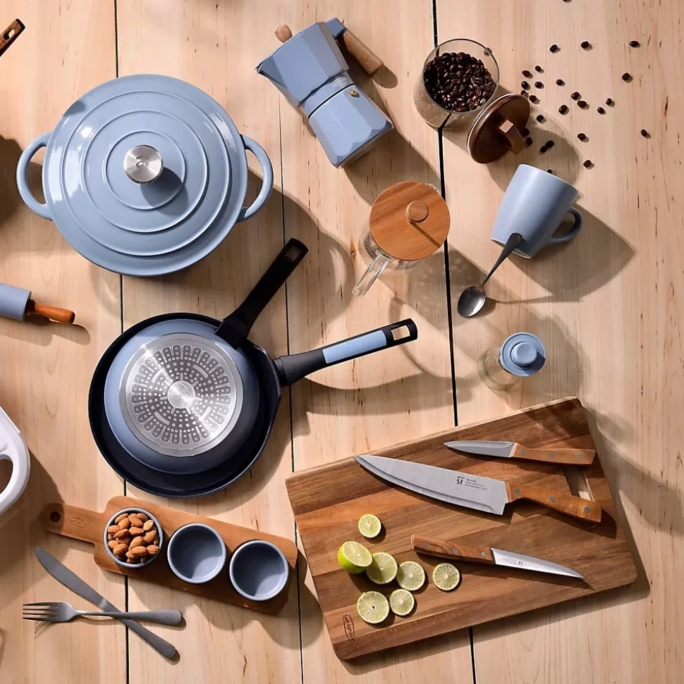 Ensemble de 3 poêles San Ignacio Collection Venus en aluminium forgé.Poêles de Ø 20, 24 et 28 cm.Poignée ergonomique douce au toucher.Revêtement antiadhésif Xylan à finition mouchetée.Couleur extérieure : champagne rosé/cuivre.Compatible avec tous les feux, y compris l’induction.Comprend un couteau de chef de Ø 20,2 cm, un couteau d’office de Ø 11,6 cm et un couteau à éplucher de Ø 8,6 cm.
