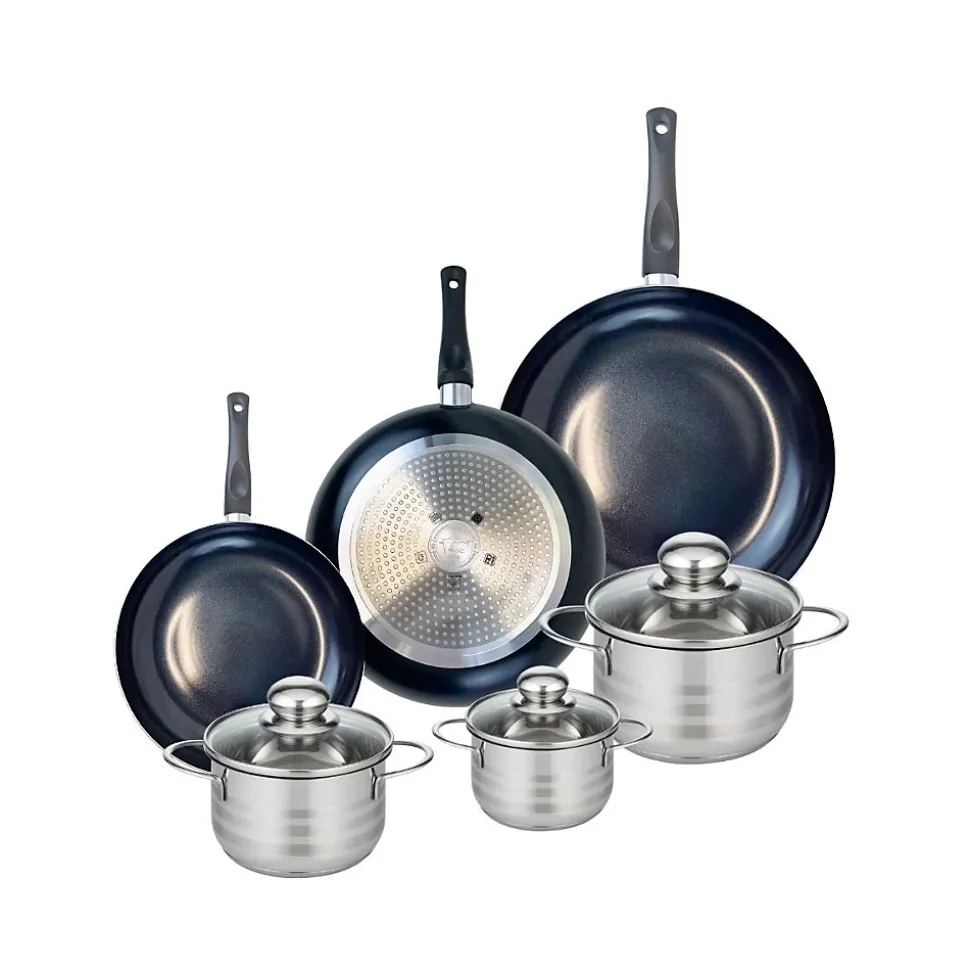 - COMPOSITION: L’ensemble comprend trois poêles en aluminium avec revêtement céramique sans PFAS de 20, 24 et 28 cm ainsi que trois faitouts en inox sans revêtement de 12, 14 et 16 cm, tous conçus pour une cuisson efficace