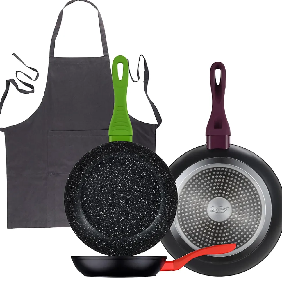 Ensemble de 3 poêles à frire en aluminium forgé de la collection Jolie de San Ignacio.Poêle à frire Ø 20 x 4,2 cmPoêle à frire Ø 24 x 5 cmPoêle à frire Ø 28 x 5,8 cmPoignées ergonomiques de couleurs différentes.Revêtement antiadhésif marbré.Compatible avec tous les types de feux, y compris l’induction.Tablier en coton gris foncé 75 x 80 cm.