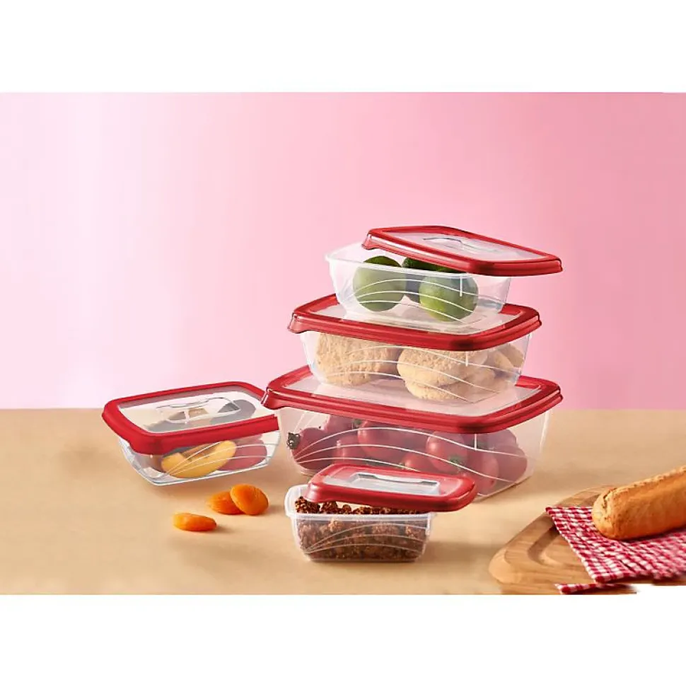 Solution de stockage tout-en-unConteneurs de stockage qui s’emboîtent commodément ensembleLe système de verrouillage unique est testé en termes de durabilité pour des performances durablesLe système de verrouillage amélioré est hermétique pour garder les aliments frais plus longtempsSans BPA pour une conservation saine des alimentsCouvercles en silicone aux couleurs vivesLes contenants vont au congélateur et au lave-vaisselle5 tailles de conteneurs et couvercles de couleur assortieLe joint en silicone amélioré est 100 % étanche à l’airGarde les aliments frais plus longtempsIl est étanche pour éviter les gouttes et les déversements indésirables.4600 ml (28,6 x 20 x 12,7 cm)2800 ml (25 x 17,8 x 11,2 cm)1600 ml (20 x 14,5 x 9,5 cm)800 ml (17 x 12,5 x 7,5 cm)400 ml (13,5 x 10 x 6 cm)