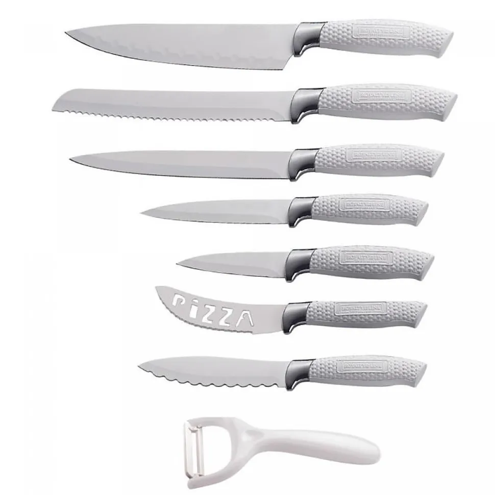 Le Royalty Line RL-WHT7-W : ensemble de couteaux à revêtement antiadhésif 7 pièces avec éplucheur, au design blanc élégant, rehaussera votre expérience culinaire. Chaque cuisine devrait avoir cet ensemble complet, qui vous donne toutes les lames nécessaires pour effectuer une variété de tâches culinaires avec facilité et précision.Le Royalty Line RL-WHT7-W comprend un ensemble complet de sept couteaux, dont un couteau à viande, un couteau de chef, un couteau à pain, deux couteaux universels, un couteau à pizza, un couteau à fromage et un éplucheur. Cette collection complète vous permet de disposer du couteau idéal pour chaque tâche de coupe et de tranchage dans votre cuisine.Soyez assuré que votre santé est préservée avec l’ensemble Royalty Line RL-WHT7-W. Ces couteaux sont exempts de substances nocives telles que le PFOA, le plomb et le cadmium. Préparez vos repas en toute confiance, en sachant que les matériaux utilisés sont sans danger pour vous et vos proches.Conçus pour un confort et un contrôle optimaux, les couteaux de cet ensemble sont dotés de manches ergonomiques antidérapants. Les poignées offrent une prise sûre, minimisant le risque d’accident et garantissant précision et stabilité lors de la découpe et du tranchage.Caractéristiques :Ensemble polyvalent de 7 pièces: Le Royalty Line RL-WHT7-W comprend un ensemble complet de sept couteaux, dont un couteau à viande, un couteau de chef, un couteau à pain, deux couteaux universels, un couteau à pizza, un couteau à fromage et un éplucheur. Cette collection complète vous permet de disposer du couteau idéal pour chaque tâche de coupe et de tranchage dans votre cuisine.Revêtement antiadhésif : Chaque couteau du set est équipé d’un revêtement antiadhésif de haute qualité. Cette caractéristique empêche les aliments de coller aux lames, ce qui permet de couper et de trancher proprement et sans effort. Dites adieu au