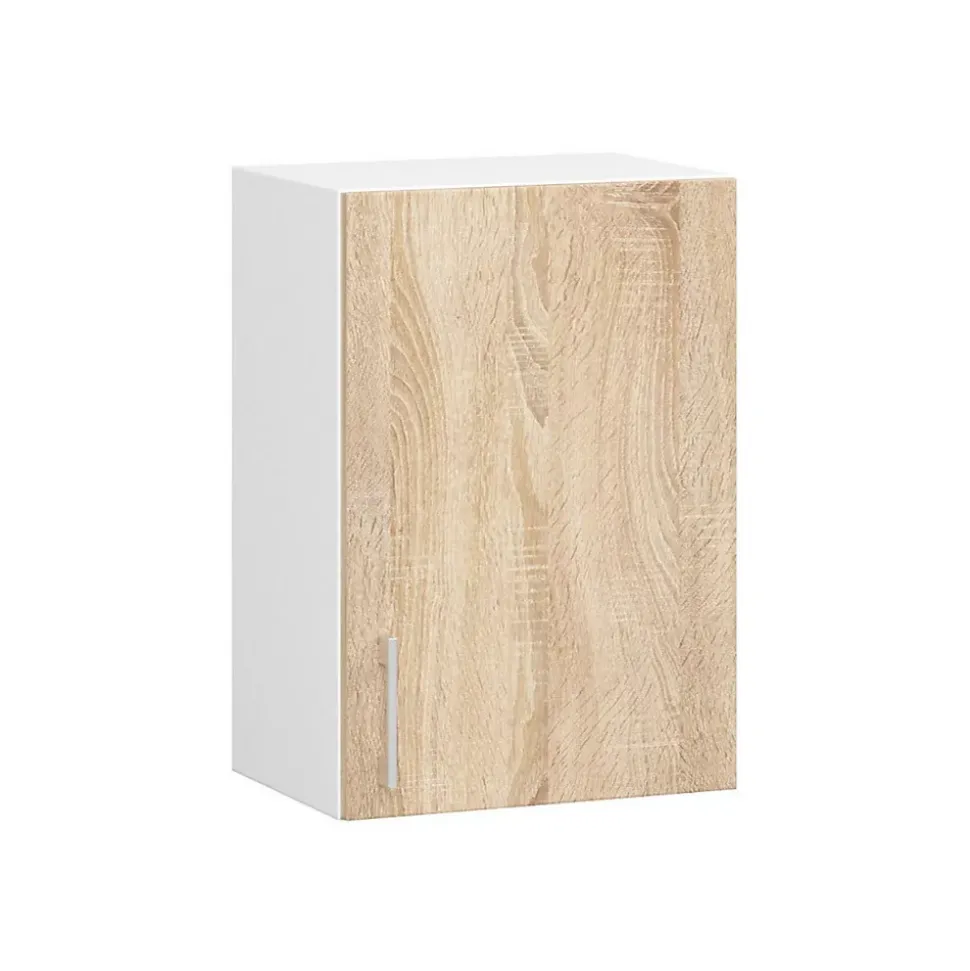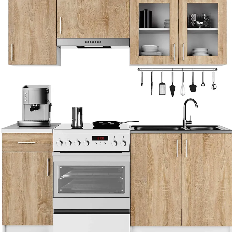 Ensemble de cuisine vitré AKORD LIMA 1.8m Blanc 180 cm 7 portes 1 tiroir façade Chêne Sonoma 8 étagères 180×44,5×203 cmL’ensemble de cuisine LIMA avec vitrine de 180 cm se compose d’un ensemble d’armoires de base conçues pour l’installation en cuisine. L’ensemble comprend le meuble sous évier S80 (80 cm) avec deux portes, le meuble sur pied étroit S40 (40 cm) avec un tiroir et des portes, le meuble suspendu W40 (40 cm) avec une porte, le meuble hotte suspendu W60 (60 cm) et l’élégant meuble suspendu W80 (80 cm) avec deux portes vitrées. L’ensemble est disponible en une seule version couleur – avec des corps blancs et des façades de couleur bois clair. Si nécessaire, l’ensemble peut être complété par des éléments supplémentaires disponibles dans la catégorie « Meubles de cuisine » de notre boutique en ligne.Dimensions:Largeur: 180cmProfondeur: 44,5cmHauteur: 203 cmMatériel: Panneau stratifiéSpécifications:Couleur:Façades: Chêne SonomaCorps de meuble: BlancFinition des façades: Finition mateMatériel: Panneau stratifiéNombre d’étagères: 8Nombre de portes: 7Porte: 7Nombre de tiroirs: 1Profondeur du tiroir: 43,5cmLargeur du tiroir: 31cmType de cabinet: Armoire sur piedType de porte: Porte battantePoids: 81,7 kgNombre d’éléments dans l’ensemble: 5