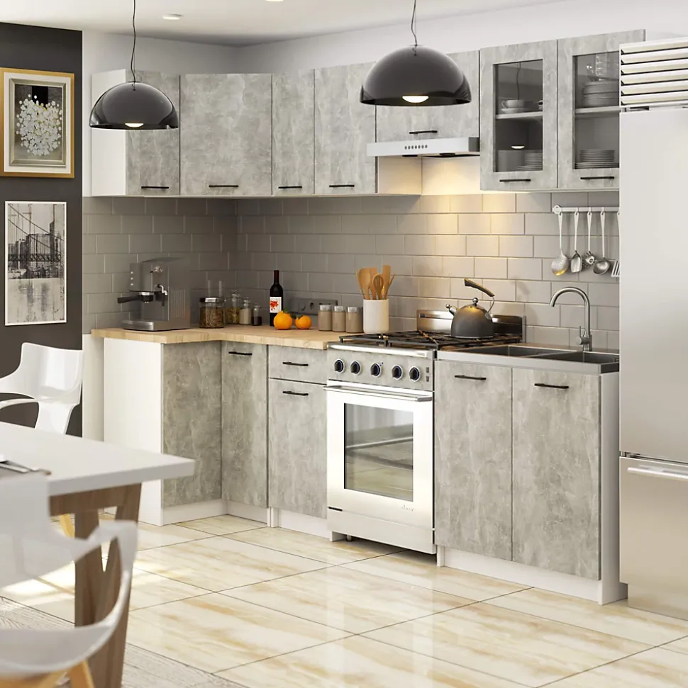 Ensemble de cuisine vitré AKORD OLIWIA 3.0m Blanc 300 cm 11 portes 1 tiroir façade Béton 300x46x203 cmL’ensemble d’angle OLIWIA avec vitrine 300 cm blanc / béton est un ensemble de meubles de cuisine destiné aux personnes qui ont besoin de beaucoup d’espace dans la cuisine. L’ensemble comprend : un meuble sur pied de 40 cm avec une porte et un tiroir, un meuble sous évier de 80 cm (deux portes) et un meuble d’angle de 90 cm. Parmi les meubles suspendus, on trouve : un meuble de 40 cm avec une porte et une étagère, un meuble sous évier de 60 cm, un meuble de 80 cm avec deux portes et une étagère, deux meubles de 30 cm, un meuble de 80 cm (deux portes et une étagère) et un meuble d’angle de 60 cm avec une étagère. Les meubles sur pied ont une profondeur de 46 cm, les meubles suspendus de 30 cm. La hauteur des meubles sur pied avec plan de travail est de 85 cm et celle des meubles suspendus de 58 cm. L’exception est le meuble de la hotte, qui mesure 30 cm de hauteur. Les couleurs de l’ensemble sont : corps blancs, façades en aspect béton et plan de travail en chêne Sonoma.Dimensions:Largeur: 300cmProfondeur: 46cmHauteur: 203 cmMatériel: Panneau stratifiéSpécifications:Couleur:Façades: BetonCorps de meuble: BlancFinition des façades: Finition mateMatériel: Panneau stratifiéNombre d’étagères: 16Nombre de portes: 11Porte: 11Nombre de tiroirs: 1Profondeur du tiroir: 43,5cmLargeur du tiroir: 31cmType de porte: Porte battantePoids: 167,7 kgNombre d’éléments dans l’ensemble: 9