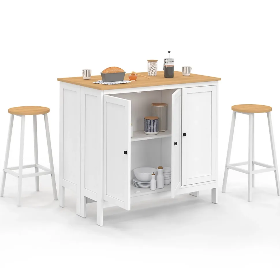 Optimisez et organisez l’espace de votre cuisine grâce à notre ensemble table de bar îlot ACHILLE avec plan de travail et rangements bois et blanc et nos tabourets ronds !Avec ses coloris intemporels et ses lignes sobres et épurées, le mange-debout ACHILLE se mariera avec tous les types d’intérieurs !Hyper pratiques, ses placards fermés avec étagères ajustables vous permettront de ranger élégamment vaisselle, petit électroménager ou encore provisions de nourriture, optimisant ainsi votre rangement avec discrétion !Tantôt coin repas, tantôt coin cuisine, avec sa triple fonction table haute de bar/plan de travail/meuble de rangement, cet îlot est à la fois pratique et stable grâce à sa structure robuste !Son format compact grâce à son plateau rabattable est idéal pour aménager les petits espaces comme les studios et être collé contre un mur ou venir délimiter deux espaces de vie avec style ! Glissez les tabourets de bar ronds sous le plateau pour un gain de place maximal !Avec leur design moderne, ses 2 tabourets de bar s’allieront à la perfection avec nôtre îlot pour donner une ambiance moderne et chic à votre intérieur !Conçus avec une structure en métal blanc, une assise en panneaux de particules de bois et équipés d’un repose pieds, les tabourets de bar ronds seront parfaits pour un usage quotidien : ils sont robustes, stables et ne craignent pas les taches.Optez sans tarder pour cette association tendance et conviviale à la fois fonctionnelle et décorative !Dimensions de l’ensemble table de bar îlot ACHILLE et 2 tabourets de bar rondsDimensions globales de l’îlot : Longueur 100 cm x largeur 60 cm x Hauteur 90 cmDimensions des portes : L.68 x H.31 cmDimensions intérieures doubles portes : L.63,5 cm l.21 x H.68 cm – 1 étagère ajustable sur 3 niveauxDimensions intérieure porte de droite : L.30,5 x l.21 x H.68 cm – 1 étagère ajustable sur 3 niveauxEncadrement : 5 cmHauteur des pieds : l.5 x H.15,50 cmMatériaux : panneaux de particules de boisColoris : bois façon hêtr
