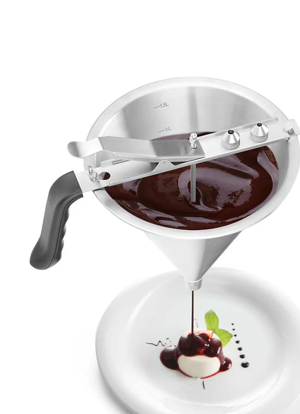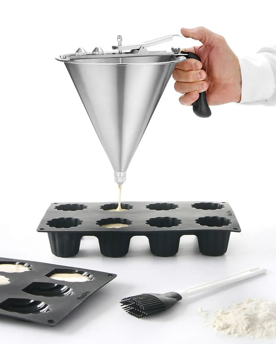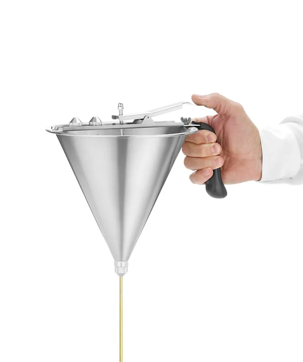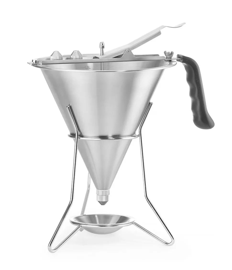 Entonnoir de dosage Profi Line 15L 212x(H)315mm Poignée ergonomique en ABS. La conception de la vanne d’arrêt assure une fermeture étanche. Avec 3 douilles (ÿ 4, 5 et 6 mm). Avec support et égouttoir. Spécialement conçu pour le dosage des sauces de compositions diverses ainsi que la décoration des plats et de la confiserie.