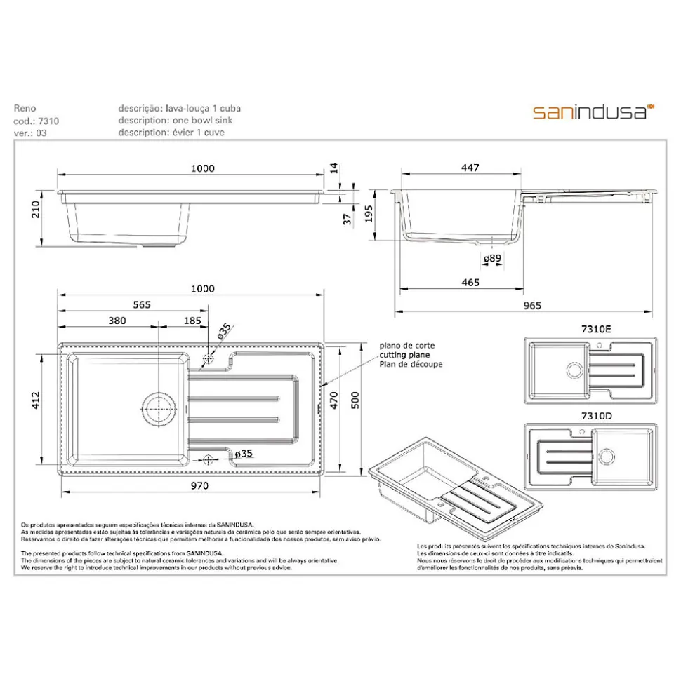 Évier Reno 1 cuve et égouttoir avec vidage. Série: Reno. Code: 7310V. Poids: 31.00. Longueur: 100. Largeur: 50. Matériel: Gres Fin. Couleur: Blanc. Contenu du paquet: Évier Reno réf. 7310 avec trop-plein rond et deux trous pré-esquissés, Vidage D90 réf. 473811. Siphon réf. 470100 non inclus. Variantes: 7310 sans vidage et avec deux trous pré-esquissés, 7310D cuve droite avec trou pour robinet, 7310DV cuve droite avec vidage et trou pour robinet, 7310E cuve gauche avec trou pour robinet, 7310EV cuve gauche avec vidage et trou pour robinet. Composants: Vidage pour évier 1 cuve Reno, Siphon pour évier 1 cuve Reno.