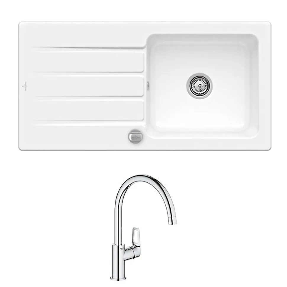 Contenu :1x Evier Villeroy et Boch1x Robinet GroheRéfs : 31368001_33601201 Caractéristiques du robinet :Installation monotrouBec pivotant jusqu’à 360 °Finition chrome avec la technologie Grohe StarLight Revêtement ultra résistant à la corrosion et au calcaireConduit d’eau isolé, sans plomb ni nickelCartouche en céramique 28 mm de haute qualitéBec avec mousseurLivré avec flexibles de raccordement souplesGarantie : 5 ansRéf : 31368001 Caractéristiques de l’évier :Pose par encastrement, recouvrementCéramiqueDisposant d’un égouttoirEvier réversibleL x l : 100 x 51 cm1 bacMeuble : 60 cmDécoupe du plan de travail de 97 x 48 cm2 trous percésVendu avec vidage automatiqueRéf : 33601201
