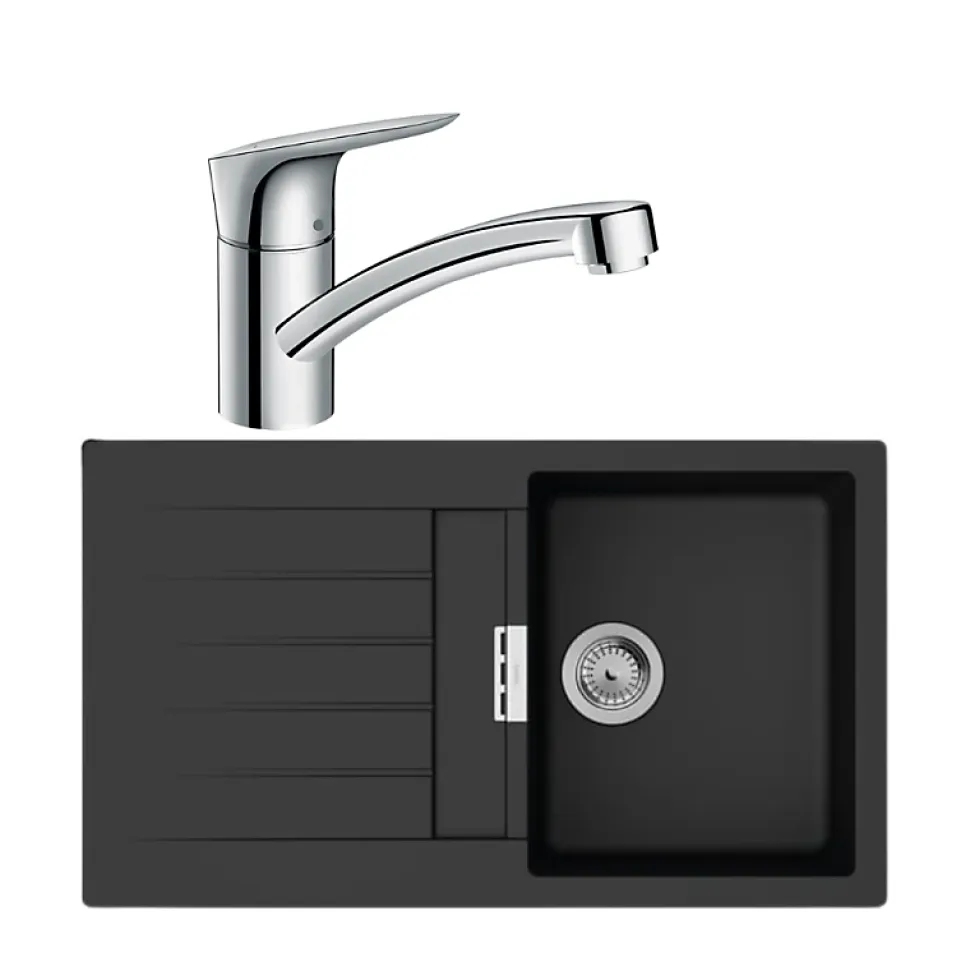 Avantages du produit de l’évierHaute qualité : En Silicatec, cet évier est insensible à la chaleur et aux produits ménagers agressifs.Gain de place : Pose par dessous, il est encastrable dans tout type de plan de travail.Réversible : L’égouttoir peut se placer à droite ou à gauche.Vidage inclus : Equipé d’un vidage manuel intégré.Gamme spécifique : Votre évier fait partie de la Gamme « in touch with our planet » Fabriqué en Allemagne : Les produits fabriqués en Allemagne sont réputés pour leur qualité exceptionnelle Caractéristiques techniques de l’évierPays d’origine : AllemagneMatériau : Quartz – SilicatecColoris : Noir graphiteInstallation : A encastrerRéversibilité : OuiAccessoires inclus : Vidage manuel inclus Dimensions de l’évierLongueur : 84 cmLargeur : 48 cmTechnologie AirPower Hansgrohe : mélange optimal de l’air et de l’eauTechnologie ComfortZone Hansgrohe : espace optimisé entre le mitigeurBec orientable à 360°Caractéristiques techniques du robinetFinition : chromeBec orientable à 360°Débit maximal : 12 l/minFlexibles de raccordement G ⅜Dimensions du robinetHauteur du mitigeur : 15,7 cmHauteur maximale (levier relevé) : 19,4 cmHauteur sous bec : 11,6 cmProfondeur (saillie) : 20,2 cm