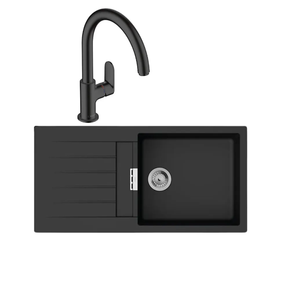Avantages de l’évierHaute qualité : En Silicatec, cet évier est insensible à la chaleur et aux produits ménagers agressifs.Gain de place : Pose par dessous, il est encastrable dans tout type de plan de travail.Réversible : L’égouttoir peut se placer à droite ou à gauche.Vidage inclus : Equipé d’un vidage manuel intégré.Gamme spécifique : Votre évier fait partie de la Gamme « in touch with our planet » Fabriqué en Allemagne : Les produits fabriqués en Allemagne sont réputés pour leur qualité exceptionnelle Caractéristiques techniques de l’évierPays d’origine : AllemagneMatériau : Quartz – SilicatecColoris : Noir graphiteInstallation : A encastrerRéversibilité : OuiAccessoires inclus : Vidage manuel inclus Dimensions de l’évierLongueur : 98 cmLargeur : 48 cmLes avantages du robinet de cuisine HANSGROHE noir mat Vernis Blend M35 210 : ComfortZone 210 : Vous offre un espace généreuxBec orientable sur 2 niveaux : 120° ou 360°Jet normal : Le robinet est équipé d’un jet normal qui assure un débit d’eau constantDébit maximal : Sous une pression de 3 bars, le robinet offre un débit généreux de 11,1 litres par minuteLes caractéristiques du robinetComfortZone 210Bec orientable possible sur 2 niveaux 120° ou 360°Jet normalDébit maximal : 11,1 l/min Cartouche céramiqueRaccordement flexible G ⅜