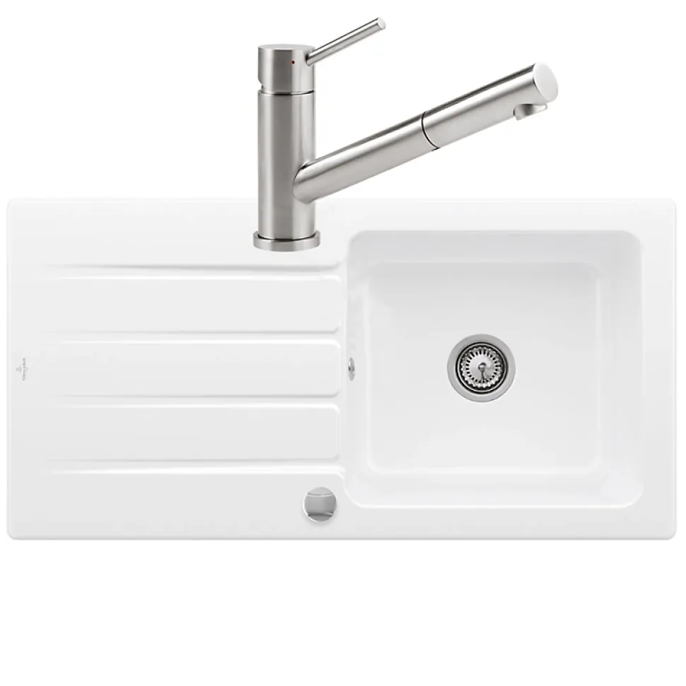Les avantages de l’Evier VILLEROY ET BOCH Architectura 60 Blanc – Vidage automatique inclusFabriqué en FranceÉvier en céramique de qualité supérieureRésistance maximaleCouleur durable, résistante à la lumière et au vieillissementMatières premières 100%sGarantie de 5 ansCaractéristiques de l’Evier VILLEROY ET BOCH Architectura 60 Blanc – Vidage automatique inclusEvier 1 bacMatériau : CéramiqueType de pose : évier pour encastrement par recouvrementChaque modèle dispose d’un égouttoirEvier reversible (l’égouttoir peut se mettre à gauche ou à droite)Couleur : BlancDimensions de l’Evier VILLEROY ET BOCH Architectura 60 Blanc – Vidage automatique inclusProfondeur de l’évier : 22 cmDimensions (L x l) : 100 x 51 cmDimension minimale du meuble sous évier : 60 cmDécoupe du plan de travail : 97 x 48 cm2 trous percés Les avantages du Robinet cuisine VILLEROY ET BOCH Como ShowerDouchette extractible de haute qualitéPivotement à 120°Revêtement anti-traces et anti-tachesJet confort : le jet est parfaitement calibré et ventillé afin d’économiser de l’eauRobinet de cuisine en acier inoxydable 100% exempt d’acide, de goût et d’émissionsRégulation de l’eau froide et de l’eau chaude à 45 ° chacuneRevêtement PVD : la surface est résistante aux UV et aux chocsAucune émission de métaux lourdsCaractéristiques techniques du Robinet cuisine VILLEROY ET BOCH Como ShowerLongueur : 28,4 cmLargeur : 27 cmHauteur : 49,5 cmMatériel : Acier inoxydableFinition : brillantCartouche : plastique avec bague en céramiqueRayon de pivotement : 120°Angle d’ouverture du levier : 25°Débit du jet : 12,6 L / minFlexibles fournis : 60 cm