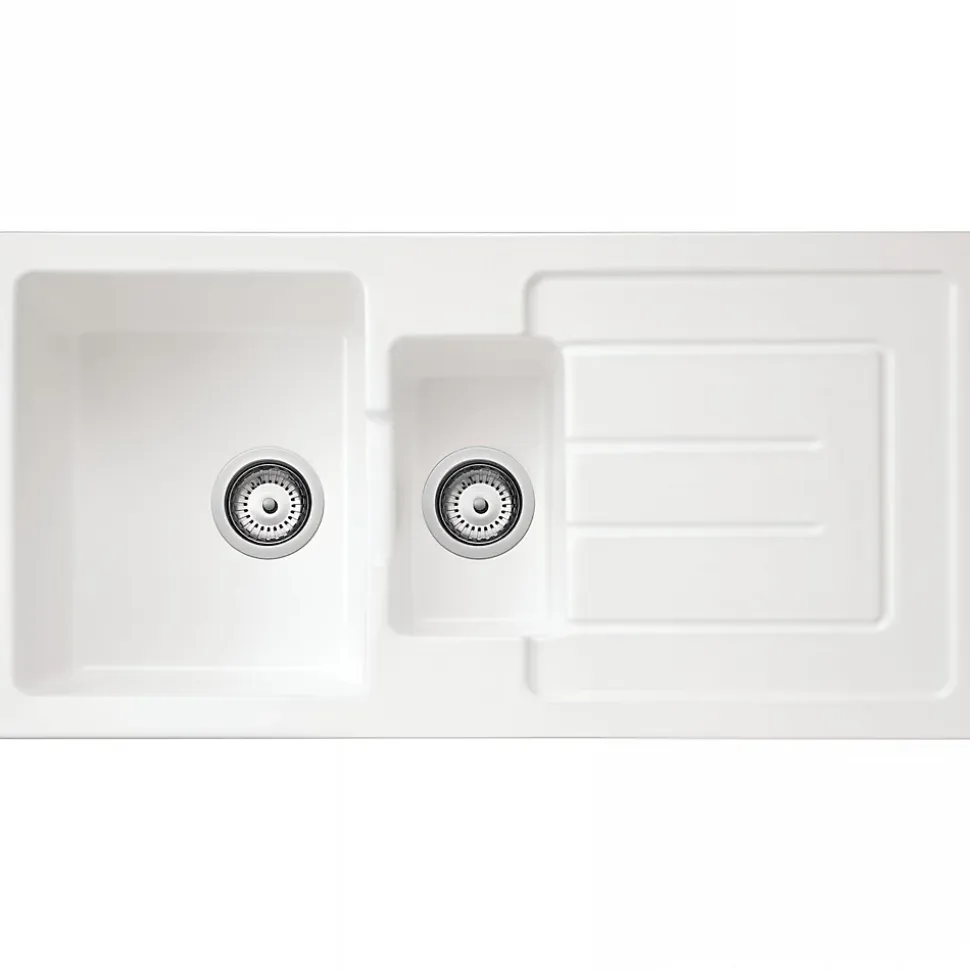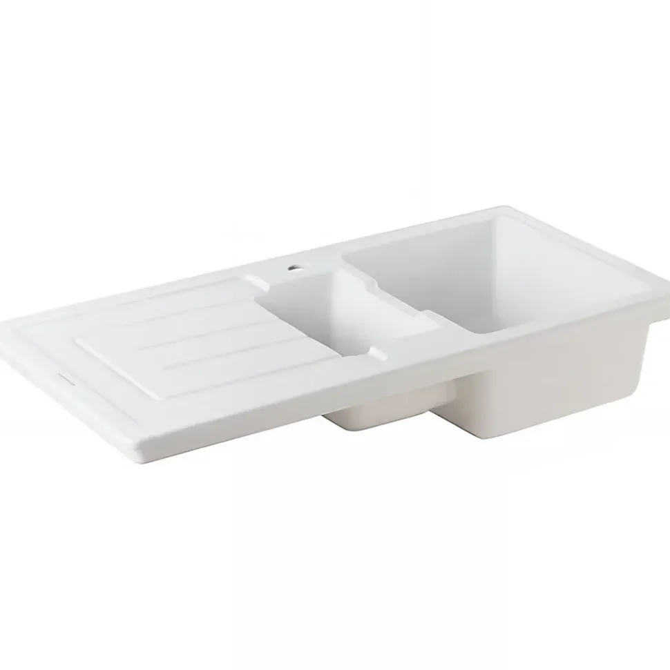 Évier Reno 1+1/2 cuve blanc, référence 731100V, EAN 5604815328493, marque SANINDUSA. Nom complet : Évier Reno 1 cuve et 1/2 avec égouttoir et vidage, série Reno, code 7311V. Dimensions : longueur 100, largeur 50, poids 33.00, matériau Gres Fin, blanc. Contenu du paquet : évier Reno réf. 7311, sans trop-plein, avec deux trous pré-esquissés, vidage D90 réf. 470311. Variantes disponibles. Composants et produits compatibles disponibles. Accessoires non inclus.