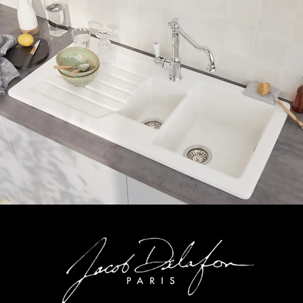 Spacieux bac principal : Offre suffisamment d’espace pour les tâches quotidiennes telles que la vaisselle et la préparation des repas.Bac et demi : Comprend une cuve principale généreuse et une cuve plus petite. parfaite pour le rinçage et le pré-triage des ustensiles.Égouttoir pratique : Dispose d’une large plage de pose résistante à la chaleur. idéale pour sécher la vaisselle et les ingrédients en toute commodité.Matériau en céramique : Robuste et durable. garantissant une longue durée de vie et une résistance aux chocs et aux rayures.Installation encastrée par-dessus : Facile à installer sur un meuble de cuisine. adapté à une largeur minimale de 60 cm.Garantie de 10 ans : Jacob Delafon offre une garantie de 10 ans sur la céramique. assurant une qualité supérieure et une tranquillité d’esprit à long terme.Réversible : Avec ses deux trous prépercés. l’évier peut être installé à gauche ou à droite selon vos besoins d’aménagement. Caractéristiques techniques de votre évier GASPARD Jacob DelafonDimensions : 100 x 50 cmPoids : 29.5 kgMatériau : CéramiqueType d’installation : Encastré par-dessusPré-perçage robinetterie : 2 trous pré-percésVendu sans système de vidageTrop-plein : Non inclusNombre de vasques : 1.5 cuvesConvient pour un meuble de 60 cm de largeur minimum