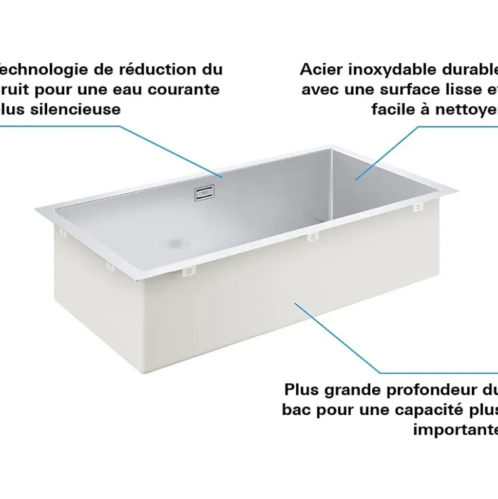 Avantages de l’évier à encastrer 1 bac XXL Résistant et éclat préservé : Fabriqué en inox GROHE StarLight AISI 304 de haute qualitéFinition Satin : surface plus lisse et moins poreuse, ce qui facilite encore plus le nettoyageTechnologie GROHE Whisper : Profitez d’une cuisine plus silencieuse grâce à une isolation spéciale sous l’évierGROHE FastFixation : Installation rapide et simplifiéeBacs XXL : Avec une profondeur de 20 cm et une longueur de 80 cm, cet évier offre un espace généreuxInclus : Livré avec vidage, siphon, bonde, et kit de montage complet Caractéristiques techniques de l’évier à encastrer 1 bac XXL Modèle : K700 90-S 86.4/46.4 1.0Montage : à encastrer par dessus ou par dessous ou affleurantMatière : acier inoxydableÉpaisseur du matériau : 1 mmTaille min. du meuble: 900 mmDimensions : 864 x 464 mm1 bac : 800 x 400 x 200 mmDécoupe (à encastrer par dessus) : 535 x 435 mm (R3)Vidage : panier Ø 3,5″ »/90 mmInclus : vidage, siphon, bonde, kit de montageQuantité d’éléments de fixation inclus (à encastrer par dessus ) : 6Total des fixations fournies : 8Avec trop pleinGROHE Finition Longue DuréeFinition SatinGROHE WhisperRéférence : 31574SD1 Pour davantage d’information, pensez à consulter les fiches produits de l’evier cuisine GROHE.