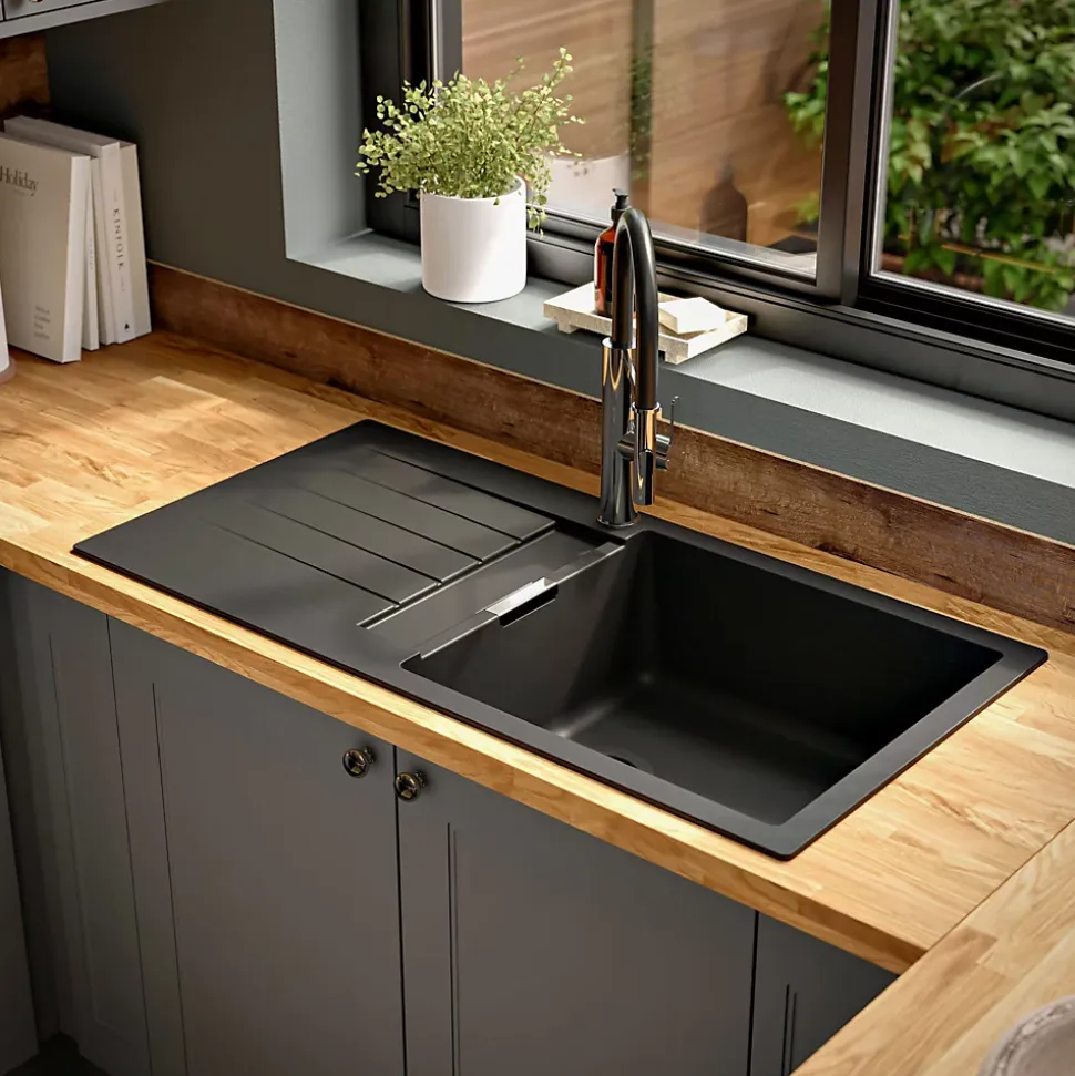 Evier à encastrer en composite quartz noir 1 bac et égouttoir l. 50 x H. 30,4 x P. 19,7 cm GoodHome Torla