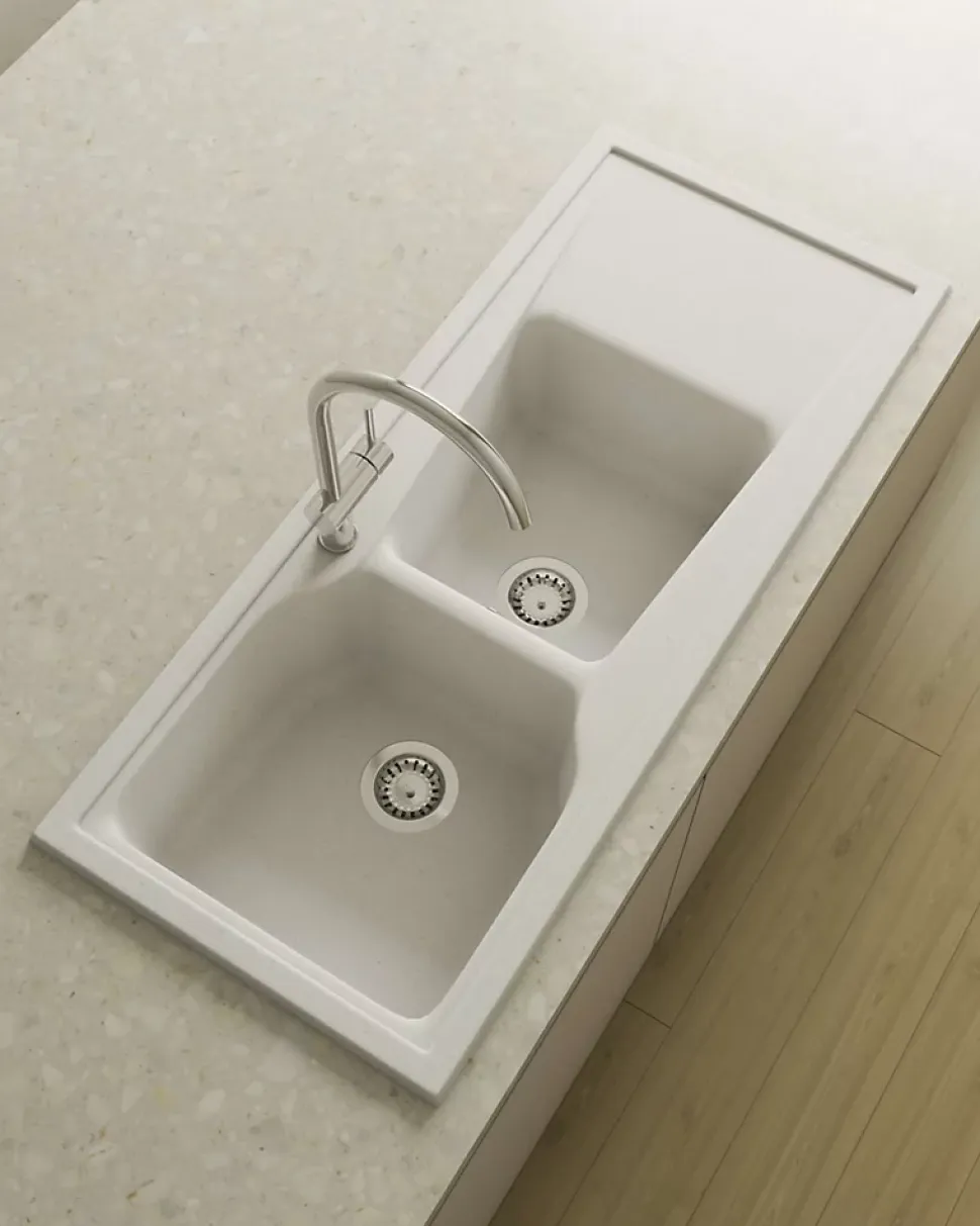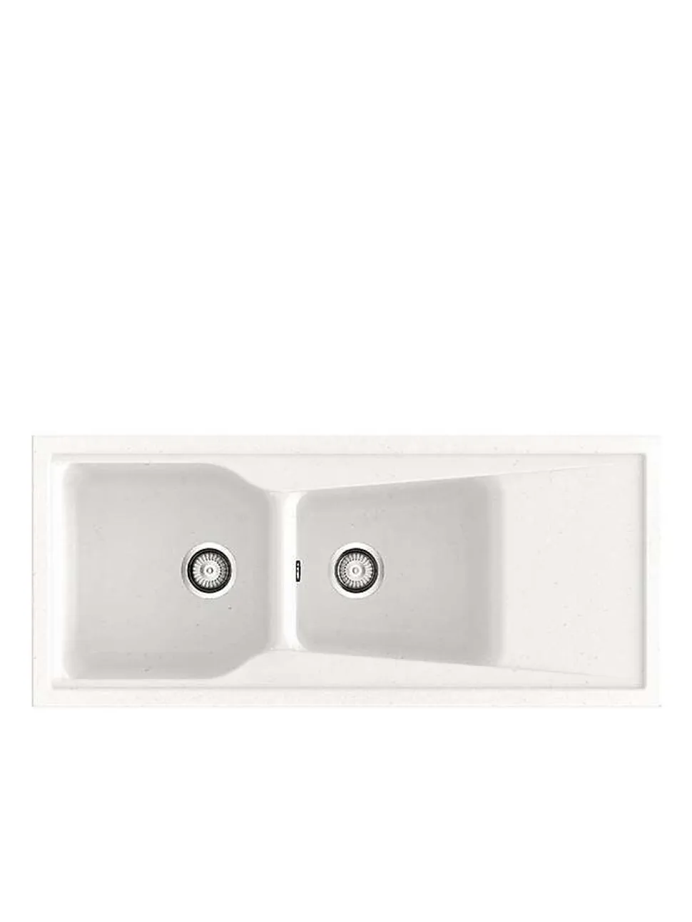 Evier à installation sur plan (à encastrer) avec deux cuves et un égouttoirRésistance aux rayures, à l’abrasion, à la chaleur (185°C), aux agents chimiques et aux colorants selon les tests UNE-EN 13310 -> Sans altérationLivré avec bonde manuelle carrée, siphon et colle mastic