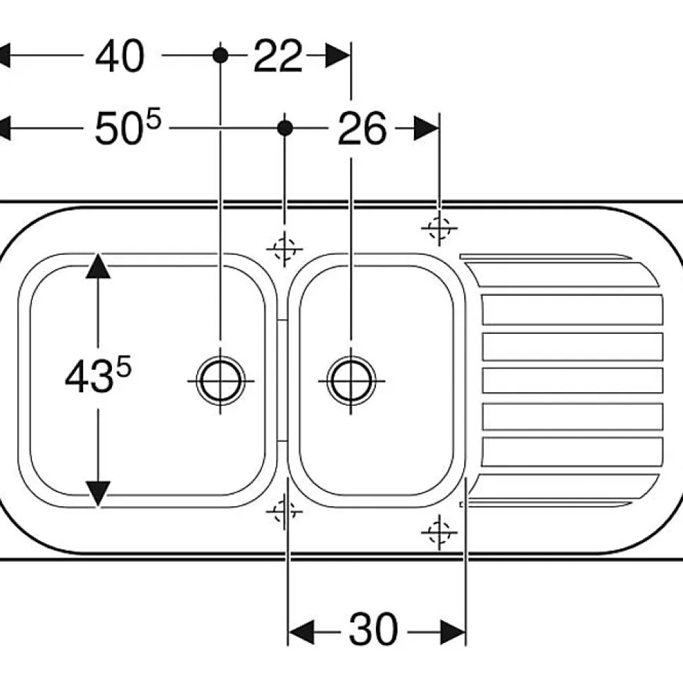 - Trous amorcés pour robinetterie monotrou, un perçage par côté.