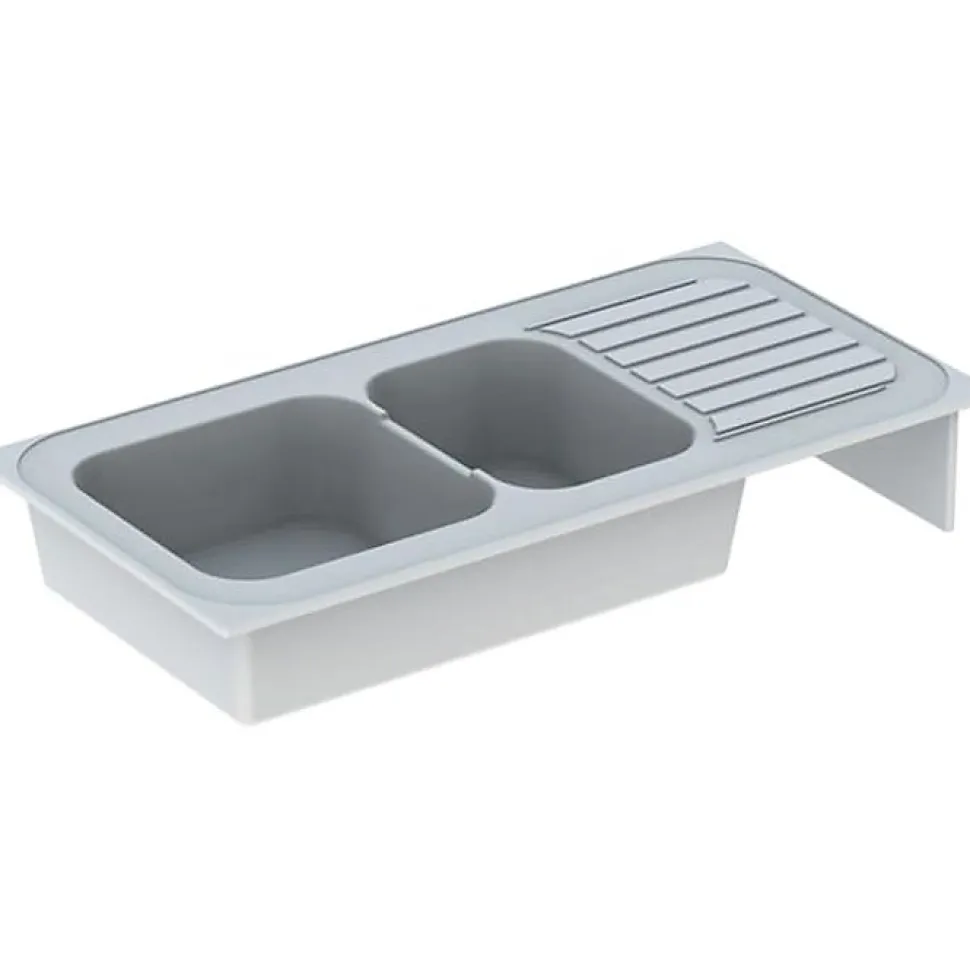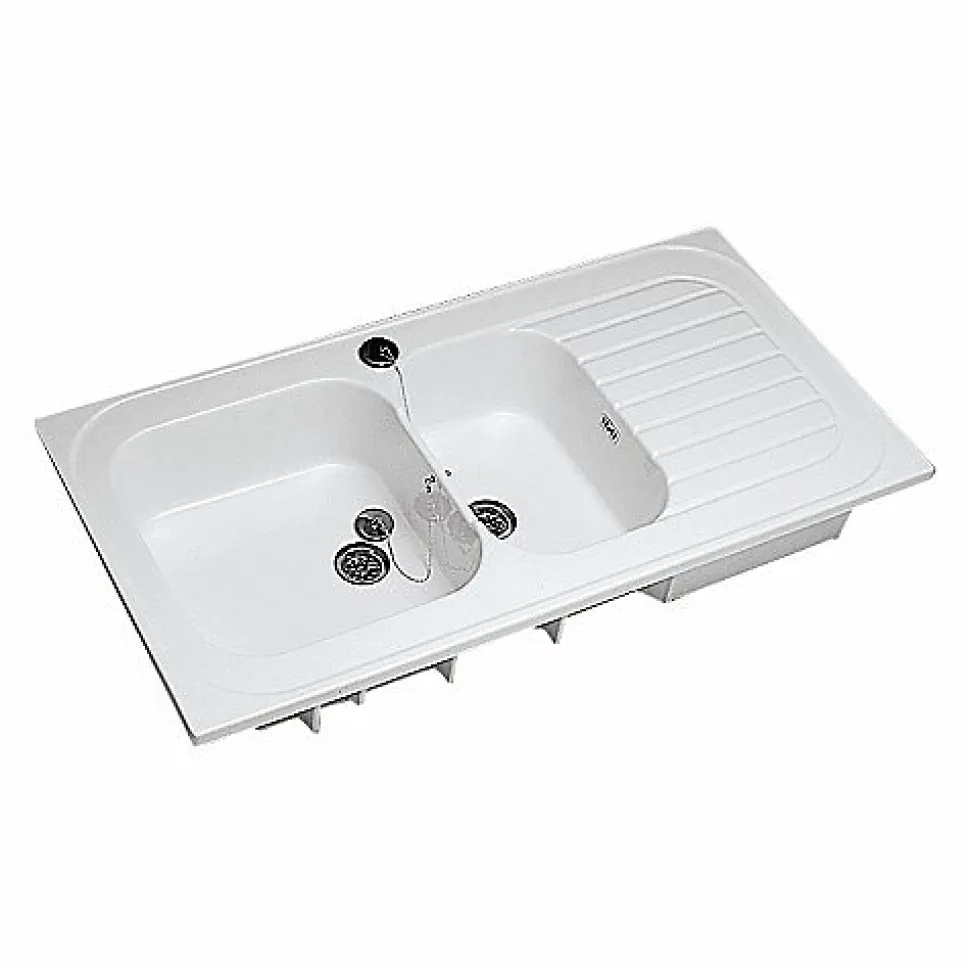 Évier 2 cuves avec 1 égouttoir en grès blanc finition matt, conçu pour montage sur plans de travail – réversible à 180° pour une installation droite ou gauche – trous amorcés pour robinetterie monotrou, un par côté – trop-plein visible – à poser sur meuble de 120 cm – vidage et fixations fournis.