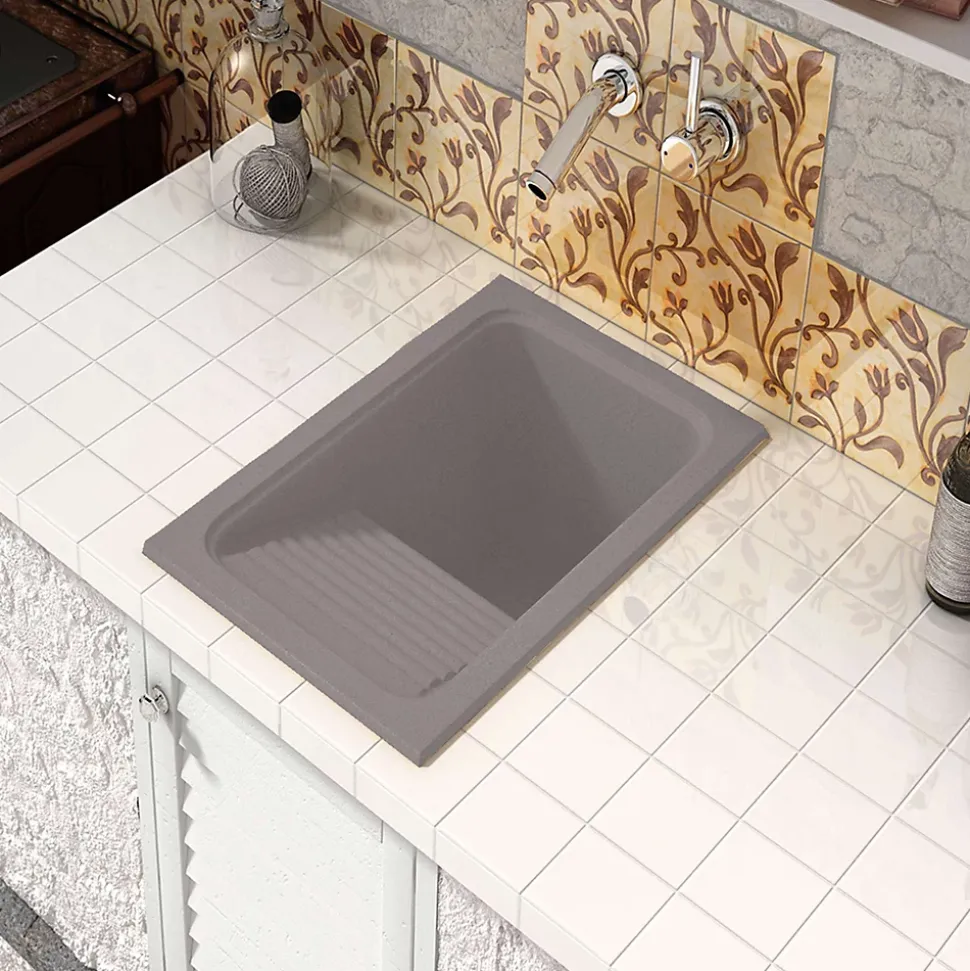 Evier ou bac à laver à installation sur plan (à encastrer) avec une cuve et un égouttoirIdéal pour buanderie, cellier ou arrière-cuisineInclus : une bonde ronde.Résistance à l’impact : 12 kgf/m2Résistance à la compression : 1595 kgf/m2Résistance à la flexion : 5110 MPARésistance thermique : 130 oCDureté Barcol (935) : 45Résistance aux tâchesAvec des détergents : Pas de changementAvec des produits anticalcaires : Pas de changement