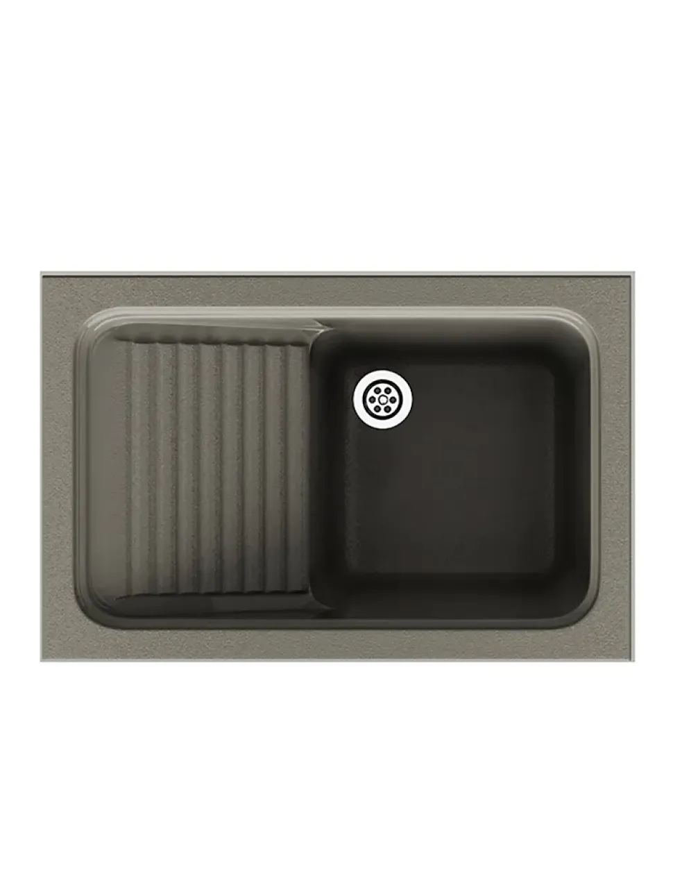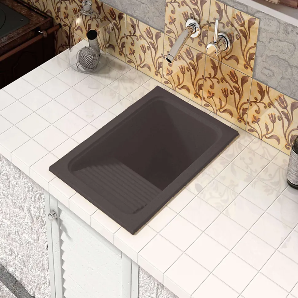 Evier ou bac à laver à installation sur plan (à encastrer) avec une cuve et un égouttoirIdéal pour buanderie, cellier ou arrière-cuisineInclus : une bonde ronde.Résistance à l’impact : 12 kgf/m2Résistance à la compression : 1595 kgf/m2Résistance à la flexion : 5110 MPARésistance thermique : 130 oCDureté Barcol (935) : 45Résistance aux tâchesAvec des détergents : Pas de changementAvec des produits anticalcaires : Pas de changement