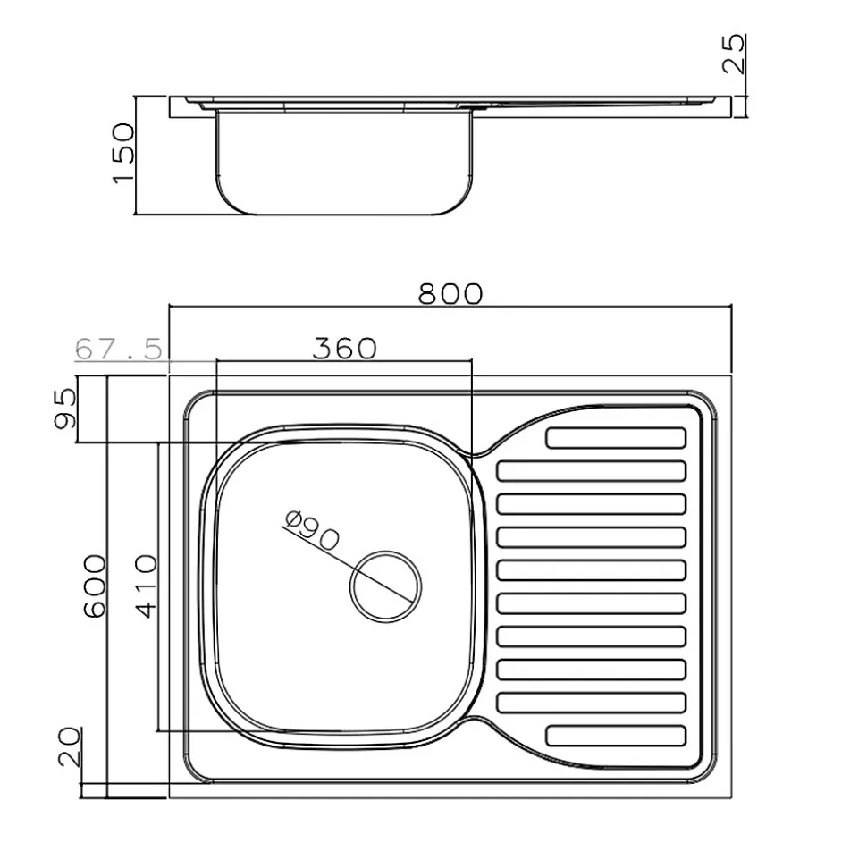 POINTS FORTS : CARACTÉRISTIQUES : • Équipements inclus : bonde(s), siphon, trop plein, tuyaux d’évacuation • Marque : sans marque • Matériau : Inox • Type de pose : à poser • Positionnement égouttoir : réversible • Coloris : Inox • Emplacement robinetterie : non percé • Nombre de bacs : 1 bac • Poids net (Kg) : 1.4 • Trop plein : oui • Sous-meuble : 80 cm • Longueur (mm) : 800 • Largeur (mm) : 600 • Longueur d’encastrement (mm) : non disponible • Largeur d’encastrement (mm) : • Grande dimension cuve 1 (mm) : 410 • Petite dimension cuve 1 (mm) : 360 • Profondeur cuve 1 (mm) : 150 • Diamètre bonde cuve 1 (mm) : 90 • Grande dimension cuve 2 (mm) : non disponible • Petite dimension cuve 2 (mm) : non disponible • Profondeur cuve 2 (mm) : non disponible • Diamètre bonde cuve 2 (mm) : non disponible • Bon à savoir : ce produit ne présente pas de spécificités supplémentaires • Vidage : manuel • Référence vidage : le vidage est déjà inclus