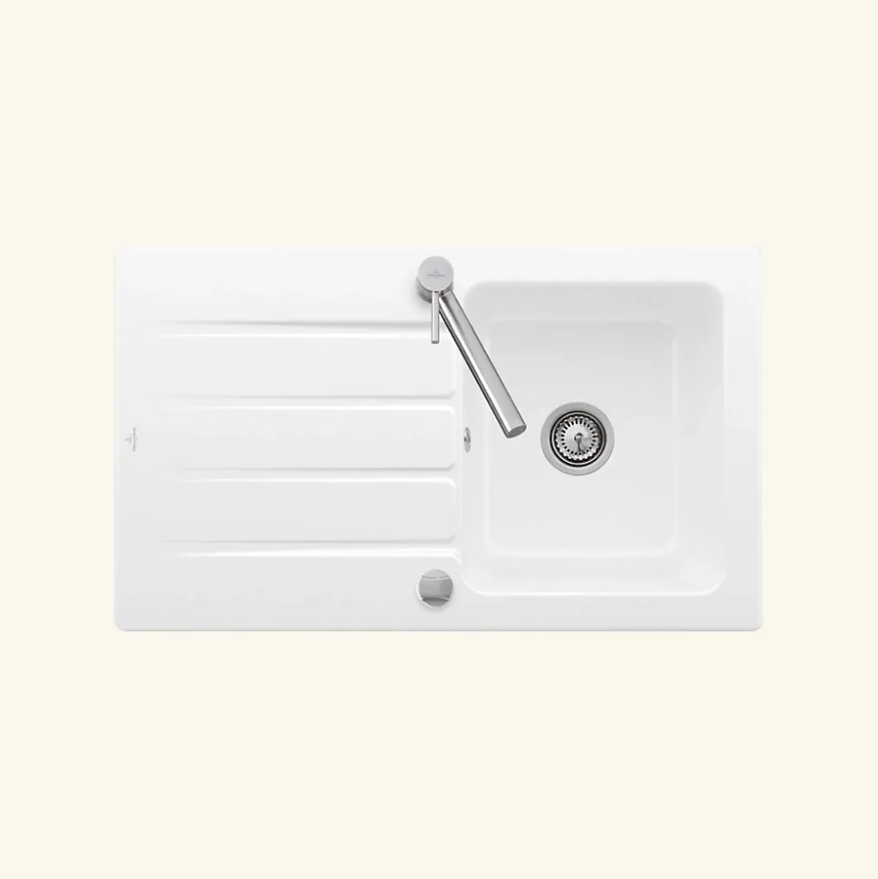 POINTS FORTS : CARACTÉRISTIQUES : • Équipements inclus : bonde(s), siphon, trop plein, tuyaux d’évacuation • Marque : Villeroy & Boch • Matériau : Céramique • Type de pose : à encastrer • Positionnement égouttoir : réversible • Coloris : Blanc • Emplacement robinetterie : percé • Nombre de bacs : 1 bac • Poids net (Kg) : 22.56 • Trop plein : oui • Sous-meuble : 50 cm • Longueur (mm) : 860 • Largeur (mm) : 510 • Longueur d’encastrement (mm) : 830 • Largeur d’encastrement (mm) : 480 • Grande dimension cuve 1 (mm) : 405 • Petite dimension cuve 1 (mm) : 345 • Profondeur cuve 1 (mm) : 220 • Diamètre bonde cuve 1 (mm) : 90 • Grande dimension cuve 2 (mm) : non disponible • Petite dimension cuve 2 (mm) : non disponible • Profondeur cuve 2 (mm) : non disponible • Diamètre bonde cuve 2 (mm) : non disponible • Bon à savoir : ce produit ne présente pas de spécificités supplémentaires • Vidage : automatique • Référence vidage : le vidage est déjà inclus