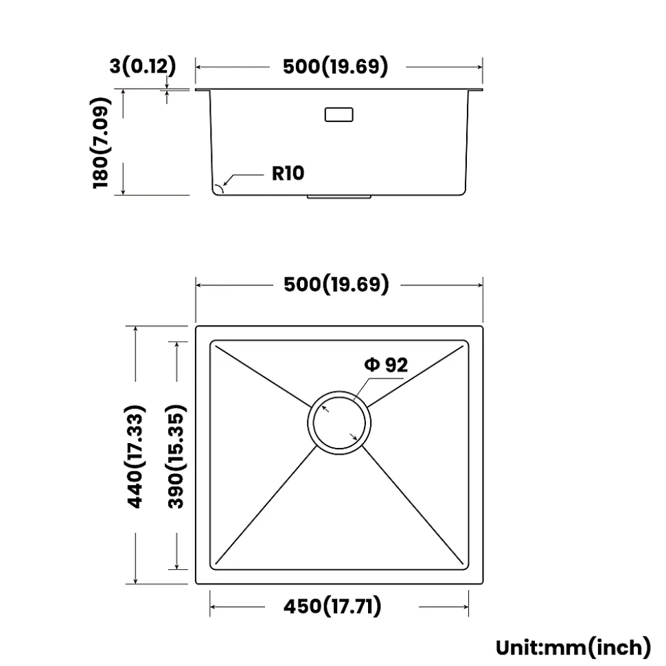 Ce bac de cuisine en acier inoxydable SUS304 de qualité alimentaire allie élégance et durabilité. Avec des dimensions de 50*43*19 cm (bac intérieur : 45*38*18,5 cm), il s’installe facilement en pose dessus, encastrée ou sous plan (recommandée), nécessitant un meuble d’au moins 50 cm. Fabriqué artisanalement par soudure laser, il offre une robustesse exceptionnelle (panneau de 3,0 mm, bac de 0,7 mm) et une surface anti-rayures et anti-taches grâce à son fini brossé. Ses fonctionnalités intelligentes incluent un angle R optimisé pour un nettoyage facile, une bonde à 360° réglable, une couche anti-condensation et une isolation EVA pour réduire le bruit de l’eau, garantissant hygiène et confort au quotidien.