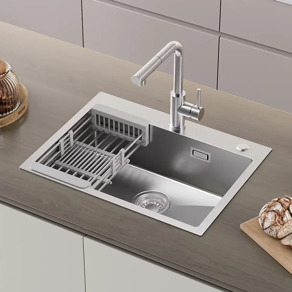 Ce modèle d’évier de cuisine en acier inoxydable SUS 304 (qualité alimentaire) allie robustesse, hygiène et design fonctionnel. Avec des dimensions de 60*45*18 cm et un bac de 55*35*17 cm, il s’installe en pose sur ou sous plan (ou encastré). Son épaisseur de 3 mm (panneau) et 0,8 mm (bac) garantit une résistance anti-déformation, tandis que les angles R2 et le revêtement nano antibactérien facilitent l’entretien. Doté d’une couche anti-condensation et d’une isolation EVA pour réduire le bruit, il intègre aussi un filtre à déchets en inox, un tuyau de drainage ajustable à 360° et un système en V pour une évacuation rapide et sans obstruction. Conforme à la norme européenne EN 13310, cet évier est idéal pour une cuisine pratique et silencieuse.