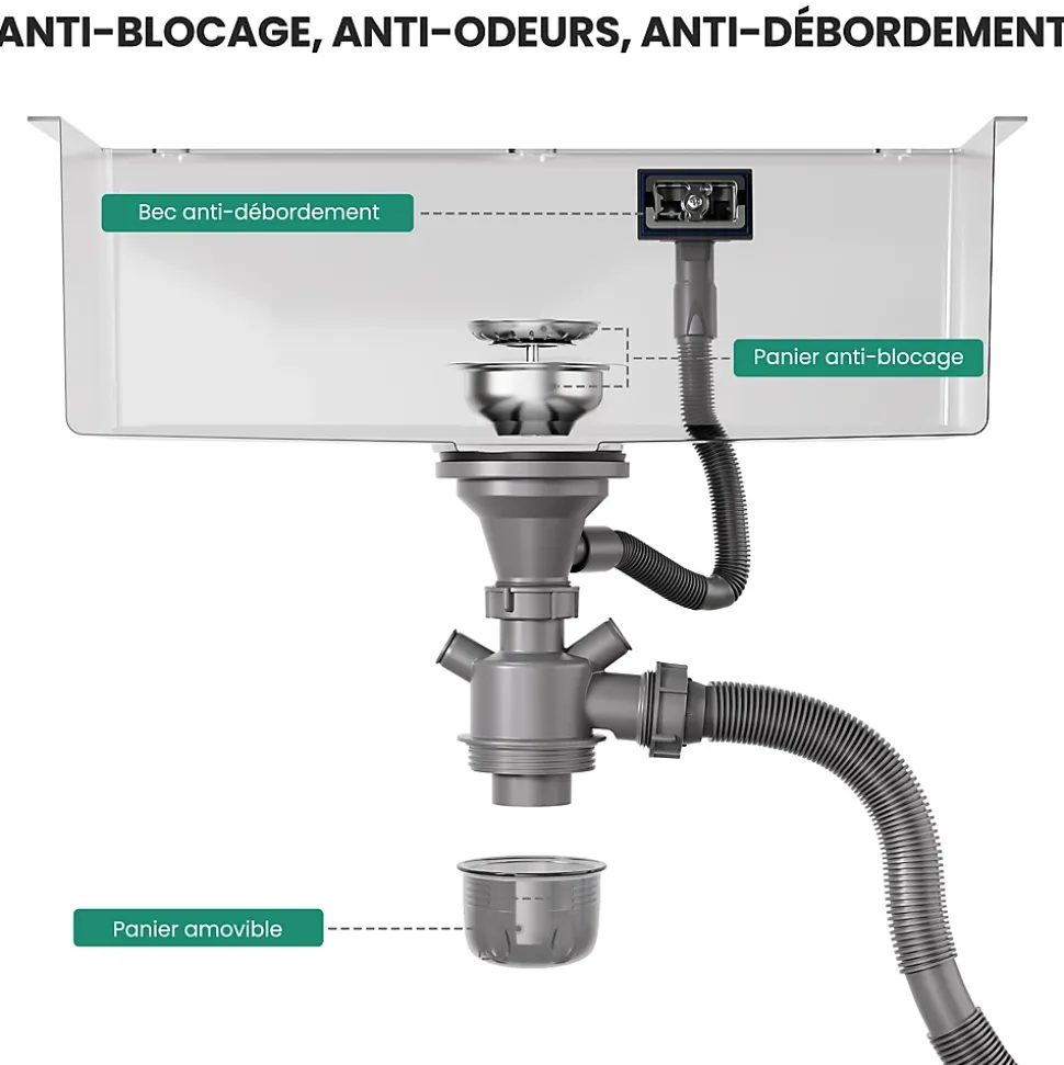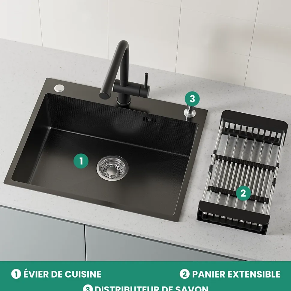 - & Kit complet : Inclut évier, Distributeur de savon, Panier égouttoir, siphon, dispositif de trop-plein, gabarit de découpe, gants et manuel d’installation. Compatible avec nos robinets et distributeurs de savon pour une harmonie esthétique.
