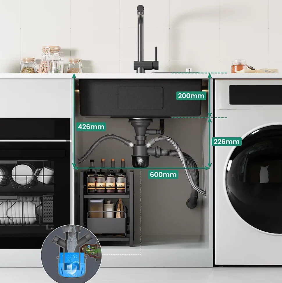 Avec ses dimensions extérieures de 60x49x20 cm et son bac spacieux de 56x39x19 cm, cet évier s’intègre parfaitement dans les meubles à partir de 60 cm. Fabriqué en acier inoxydable haute qualité avec revêtement nanotecnologie, il résiste à la corrosion, aux rayures et aux taches tout en conservant sa finition satinée professionnelle. Son fond incurvé avec système de drainage en X assure une évacuation optimale de l’eau et réduit l’accumulation des déchets. Équipé de 5 tapis insonorisants et d’un revêtement anti-condensation couvrant 95% de sa surface, il élimine les bruits d’éclaboussures et protège vos meubles de l’humidité. La solution idéale pour une cuisine à la fois fonctionnelle et silencieuse.