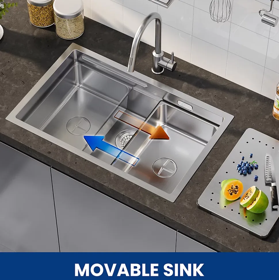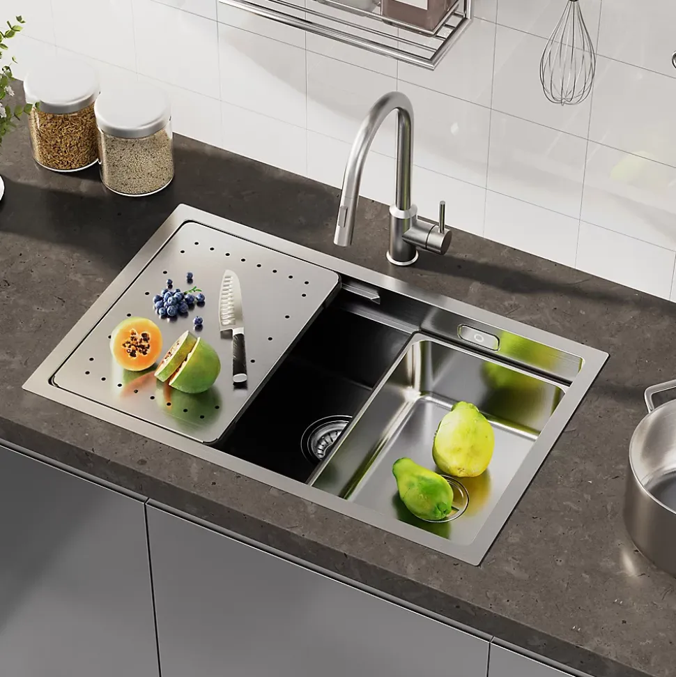 Ce grand évier de cuisine en acier inoxydable 304 (fini brossé) allie robustesse, fonctionnalité et design premium. Avec ses dimensions spacieuses (70×44×21 cm, cuve intérieure : 65×39×20 cm), il offre une capacité maximale et s’installe facilement en pose dessus, encastrée ou sous plan (recommandée), idéal pour les meubles de 80 cm minimum. Fabriqué artisanalement par soudure laser, il garantit une longévité exceptionnelle (panneau 3 mm, cuve 0,7 mm) et une surface anti-traces, anti-corrosion et facile à nettoyer. Ses innovations incluent un angle R optimisé, un système anti-débordement discret, une bonde orientable à 360°, un siphon anti-odeurs avec 2 raccords pour lave-vaisselle, ainsi qu’un drainage en X pour éviter l’eau stagnante. L’isolation EVA et la couche anti-condensation assurent un usage propre, silencieux et sans condensation.