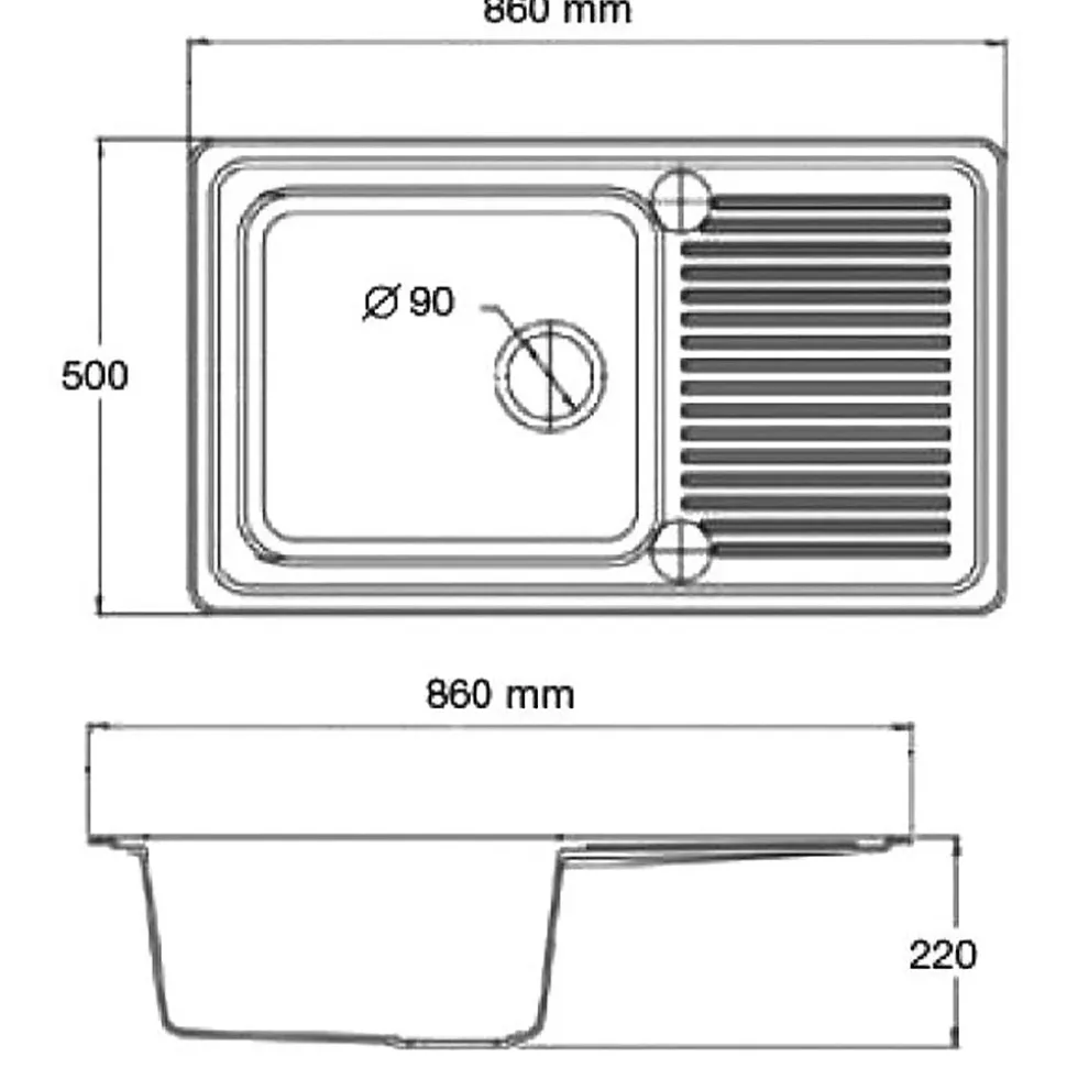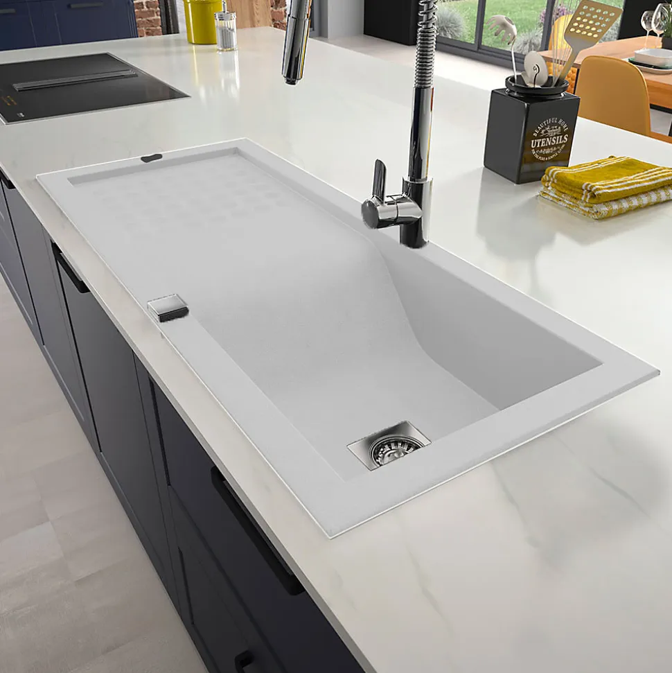 Évier de cuisine réversible à encastrer avec 1 cuve et 1 égouttoir FABRICATION FRANÇAISEOptez pour cet évier en résine minérale composite, un matériau robuste et esthétique, idéal pour un usage quotidien. Avec sa conception réversible, il s?adapte parfaitement à vos besoins, offrant la possibilité d?installer l?égouttoir à gauche ou à droite selon vos préférences. Fabrication durable et résistance optimale Fabriqué en résine minérale composite de haute qualité, cet évier se distingue par sa grande résistance aux chocs, aux rayures et aux températures extrêmes (-40 C à +300 C). Sa couleur blanc moucheté et sa finition soignée ajoutent une touche élégante et moderne à votre cuisine. Détails de l?évier de cuisine : Matière : Résine minérale compositeColoris : blanc mouchetéNombre de cuves : 1Égouttoir : OuiRéversible : OuiType de vidage : ManuelTrou de perçage vidage : Oui (diamètre 90 mm)Trou de perçage robinetterie : NonDimensions de l?évier : 86 x 50 x 22 cmDimensions de la cuve : 43 x 38 x 20 cmEncastrement : Meuble à partir de 50 cmPlan de découpe : 83 x 47 cmPoids : 9 kgAttention, robinetterie non incluse.Contenu de la livraison :1 notice de pose1 schéma de découpe1 système de vidage manuel avec siphon8 équerres de fixationConseils d?entretien :Résiste à une large gamme de températures (-40 C à +300 C).Entretien facile grâce à sa surface lisse et résistante aux produits d?entretien.Nettoyer avec une éponge douce et un détergent non abrasif pour préserver son aspect d?origine. Ce que nous aimons : Polyvalence et adaptabilité : Réversible, cet évier peut être installé avec l’égouttoir à gauche ou à droite selon vos contraintes et préférences.Robustesse et durabilité : Le matériau composite garantit une grande résistance aux chocs et rayures tout en étant facile d?entretien.