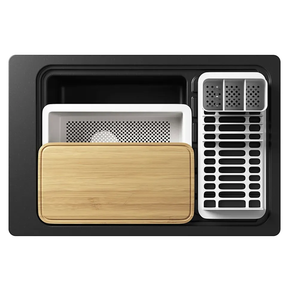 Le design compact de l’évier Romesco associé à des accessoires d’évier intégrés innovants crée un système d’évier intelligent et unique qui maximise la fonctionnalité, le tout dans l’empreinte d’un évier compact. Les accessoires d’évier intégrés permettent des tâches fonctionnelles clés telles que la préparation des aliments, le lavage et le séchage à l’intérieur de la cuve d’évier, vous économisant ainsi un espace précieux sur votre plan de travail