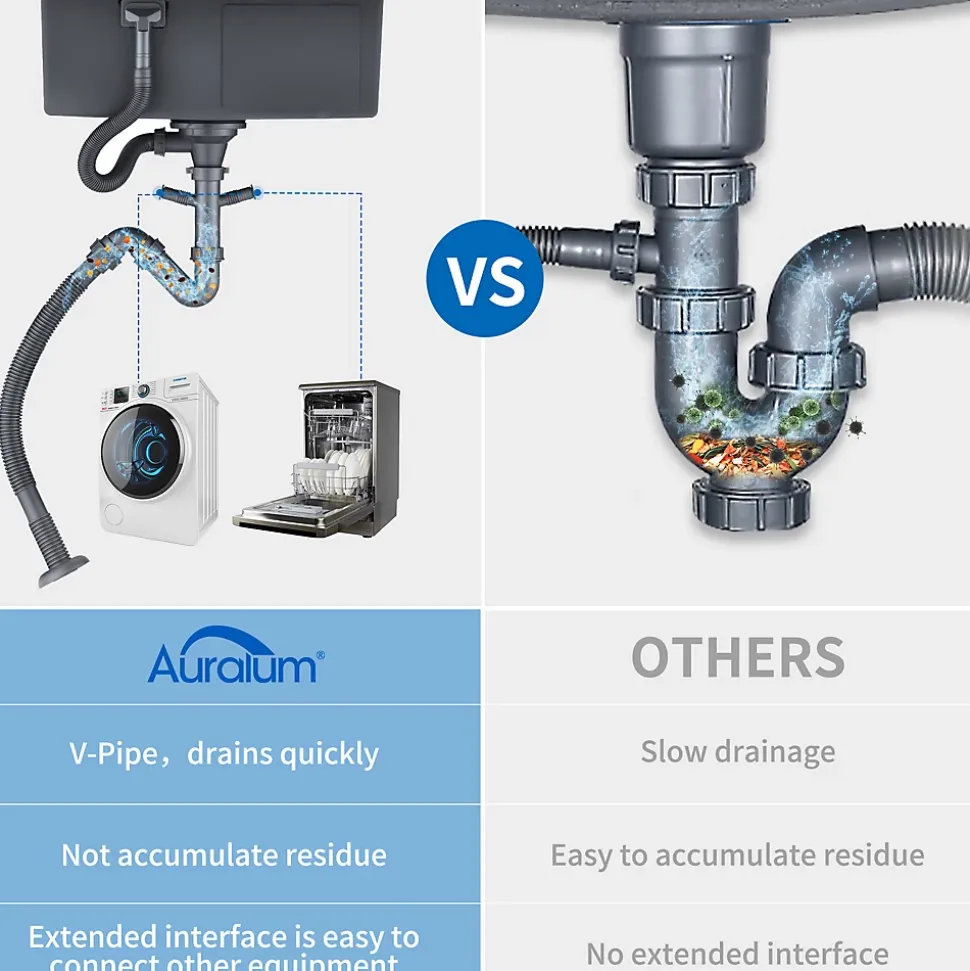 - ✔ Drainage intelligent – Conception en V anti-bouchons + tuyau orientable à 360° pour un gain de place sous l’évier.