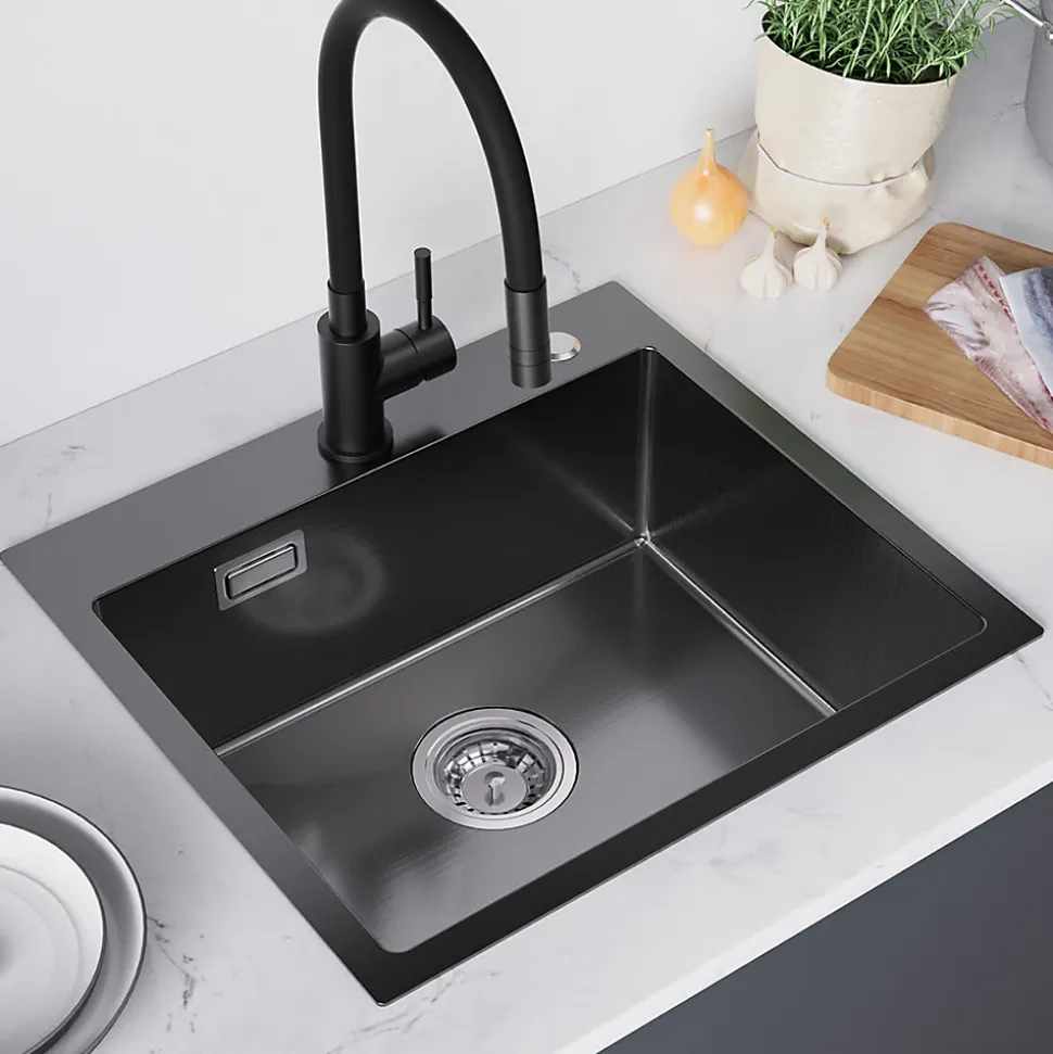 Avec ses dimensions extérieures de 50×45 cm et son bac généreux de 45x35x18 cm, cet évier noir s’intègre parfaitement dans les meubles à partir de 50 cm, offrant un espace de travail optimisé sans compromis sur la capacité. Fabriqué en acier inoxydable SUS201 avec nano-revêtement PVD ultra-résistant, il supporte chocs, températures élevées et produits corrosifs tout en restant facile à nettoyer grâce à sa surface anti-rayures. Son design intelligent comprend 2 ouvertures pré-percées (35mm et 28mm) pour robinet et distributeur, un siphon avec raccords lave-vaisselle, un système de vidange à trop-plein et un fond en X pour un drainage rapide. Le coussin insonorisé intégré réduit les bruits d’eau et de vaisselle. Livré complet avec siphon, accessoires de vidange et notice d’installation simplifiée, cet évier encastrable ou sur plan combine praticité, durabilité et esthétique moderne pour les cuisines compactes