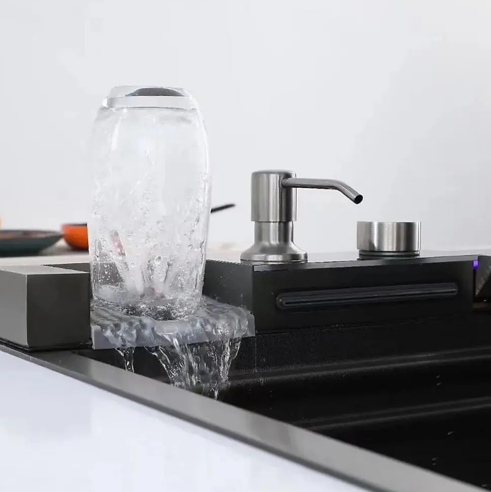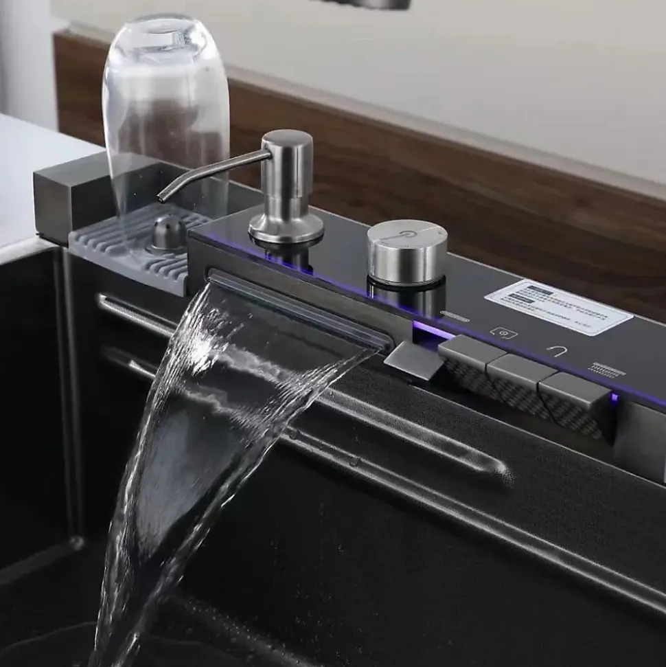 Description du produit :Ses dimensions sont de 75 cm de large, 22 cm de haut et 46 cm de profondeur.Évier nano rectangulaire gris Cerus Kleenmac avec affichage numérique.Fabriqué en acier inoxydable 304 brossé.L’affichage numérique indique la température de l’eau et le temps d’utilisation en temps réel.Il dispose d’une lumière d’ambiance bleue qui s’allume lorsque l’eau commence à couler.5 modes d’eau : robinet extractible avec 3 modes de sortie d’eau plus 2 modes cascade pour nettoyer de grandes surfaces.Contrôle indépendant de 2 cascades, lave-verres et robinets amovibles et Plus un autre robinet d’eau pure dans le coin droit.Conception à double marche sur le côté de l’évier. Une division plus efficace.Idéal pour une utilisation dans des endroits tels que les bars, les balcons, les tables à manger, les cuisines, etc.Coin R conçu pour faciliter le nettoyage et l’hygiène des coins.Il dispose d’un drain sur le côté droit, d’un angle en bas pour un drainage en douceur, d’un trop-plein sur le côté droit pour éviter un débordement excessif de l’eau.Son silencieux en caoutchouc et sa couche anti-condensation Nano épaissie située au fond de l’évier sont conçus pour réduire le bruit et garder l’armoire propre et bien rangée.Ce produit comprend un évier de cuisine nano (SS 304), un robinet d’eau de pluie à deux niveaux avec affichage numérique intégré et un petit robinet d’eau pure, une planche à découper, un petit lavabo, des tuyaux d’égout, un égouttoir, un flacon distributeur de savon et d’autres accessoires adaptés.