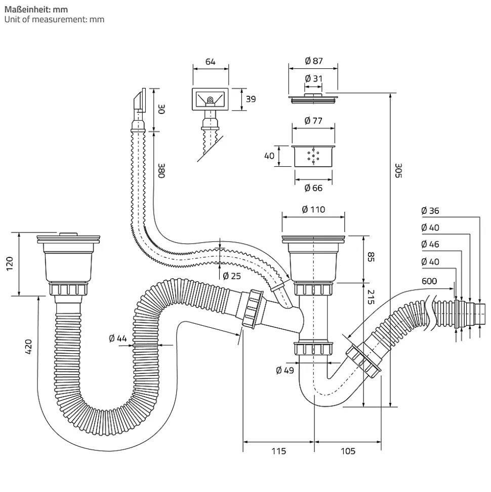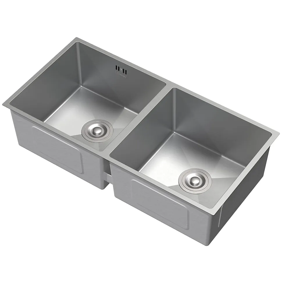 Description du produit:Double fonctionnalité en parfaite harmonie : ton nouvel évier double en inox (81,5 x 40 cm).Découvre le confort et l’élégance d’un évier encastré spacieux dans ta cuisine ! Avec ce double évier en inox de haute qualité (81,5 x 40 cm), tu disposes non seulement de suffisamment de place pour tous tes travaux de cuisine, mais aussi d’un design intemporel qui s’intègre parfaitement à tout environnement de cuisine.Aperçu de tes avantages:Double confort de travail : deux vasques spacieuses d’une profondeur de 19 cm chacune t’offrent suffisamment de place pour laver, égoutter et préparer.Écoulement optimal de l’eau : les plis dans la cuve assurent un écoulement libre de l’eau et empêchent l’eau de stagner.Montage flexible : qu’il soit encastré, à poser ou à encastrer, cet évier s’adapte parfaitement à tes besoins individuels et aux circonstances.Acier inoxydable de haute qualité : l’évier est fabriqué en acier inoxydable durable, hygiénique et facile à entretenir.Vaisselle silencieuse : les tapis insonorisants intégrés atténuent les bruits lors de la vaisselle et garantissent un calme agréable dans ta cuisine.Protection contre la condensation : un revêtement de protection spécial empêche la formation de condensation gênante à l’extérieur de l’évier.Garniture de vidage incluse : la garniture de vidage adaptée est incluse dans la livraison, de sorte que tu peux utiliser ton évier immédiatement après le montage.Cet évier en acier inoxydable est le choix parfait pour toi si tu accordes de l’importance à la qualité, à la fonctionnalité et au design moderne.Livraison:1 x évier double1 x garniture d’écoulement et de trop-pleinAttention: un robinet n’est pas inclus dans la livraison!Information technique:Matériau : acier inoxydableCouleur : argentPoids : 8,4 kgDimensions : 815 x 400 mmProfondeur cuve : 190 mmHauteur : 200 mmÉpaisseur du matériau du bassin : 1 mmEpaisseur du panneau supérieur : 1 mm