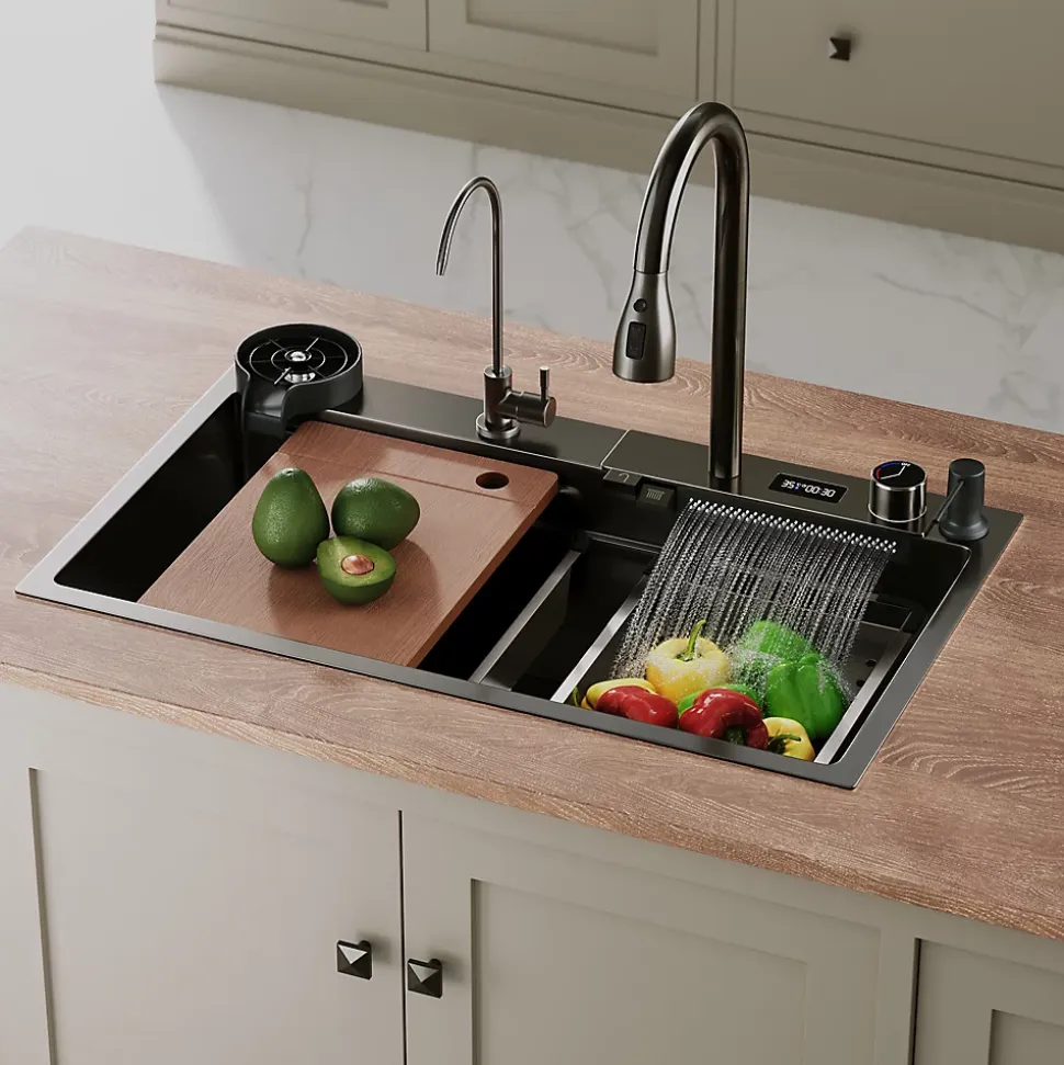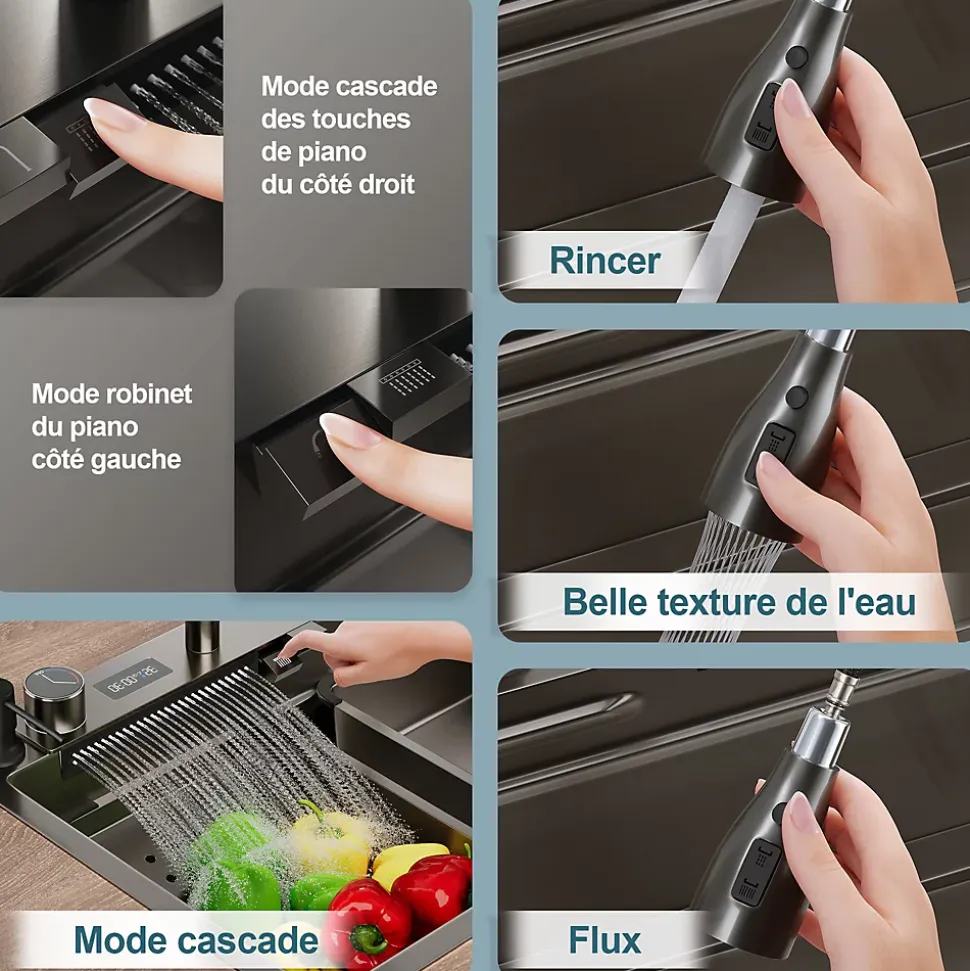 SIRHONA s’attache toujours à vous créer une meilleure expérience à domicile, en vous proposant des Miroirs, Cabine de Douche, Meuble, Bureau et Salle de Bain.Données sur le produitTaille : 750x450x230mm Couleur : NoirMatériau : SUS304Épaisseur du matériau : panneau 3,0 mm + fente 0,7 mmFonction : avec robinet de pluie, double bouton, avec affichage de la température.Liste des produits : corps d’évier, ensemble de robinets Feiyu, lavabo, panier de filtre à eau, robinet d’eau propre, lave-tasses, distributeur de savon, planche à découper, couvercle de vidange, ensemble de vidange, etc.Pression de l’eau : 0,1-0,5Mpa(5bar)Pression antidéflagrante de l’interrupteur à volant : 2,5 MpaTempérature maximale de fonctionnement de la pomme de douche : 60 degrés Celsius