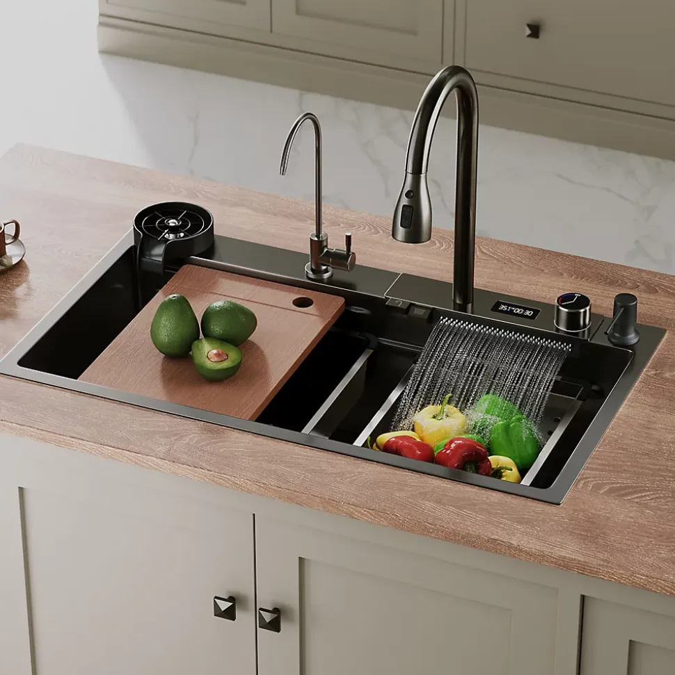 SIRHONA s’attache toujours à vous créer une meilleure expérience à domicile, en vous proposant des Miroirs, Cabine de Douche, Meuble, Bureau et Salle de Bain.Données sur le produitTaille : 800x450x230mm Couleur : NoirMatériau : SUS304Épaisseur du matériau : panneau 3,0 mm + fente 0,7 mmFonction : avec robinet de pluie, double bouton, avec affichage de la température.Liste des produits : corps d’évier, ensemble de robinets Feiyu, lavabo, panier de filtre à eau, robinet d’eau propre, lave-tasses, distributeur de savon, planche à découper, couvercle de vidange, ensemble de vidange, etc.Pression de l’eau : 0,1-0,5Mpa(5bar)Pression antidéflagrante de l’interrupteur à volant : 2,5 MpaTempérature maximale de fonctionnement de la pomme de douche : 60 degrés CelsiusAttention !!!Après utilisation, vous devez fermer l’interrupteur à volant, sinon il restera allumé pendant une longue période, ce qui endommagera les touches du piano ou le robinet et provoquera des fuites.Pression de service de l’eau : 0,1-0,5Mpa (5bar), la pression de service maximale est de 0,5Mpa, lorsque la pression de l’eau est supérieure à 0,5Mpa, vous devez installer un réducteur de pression.