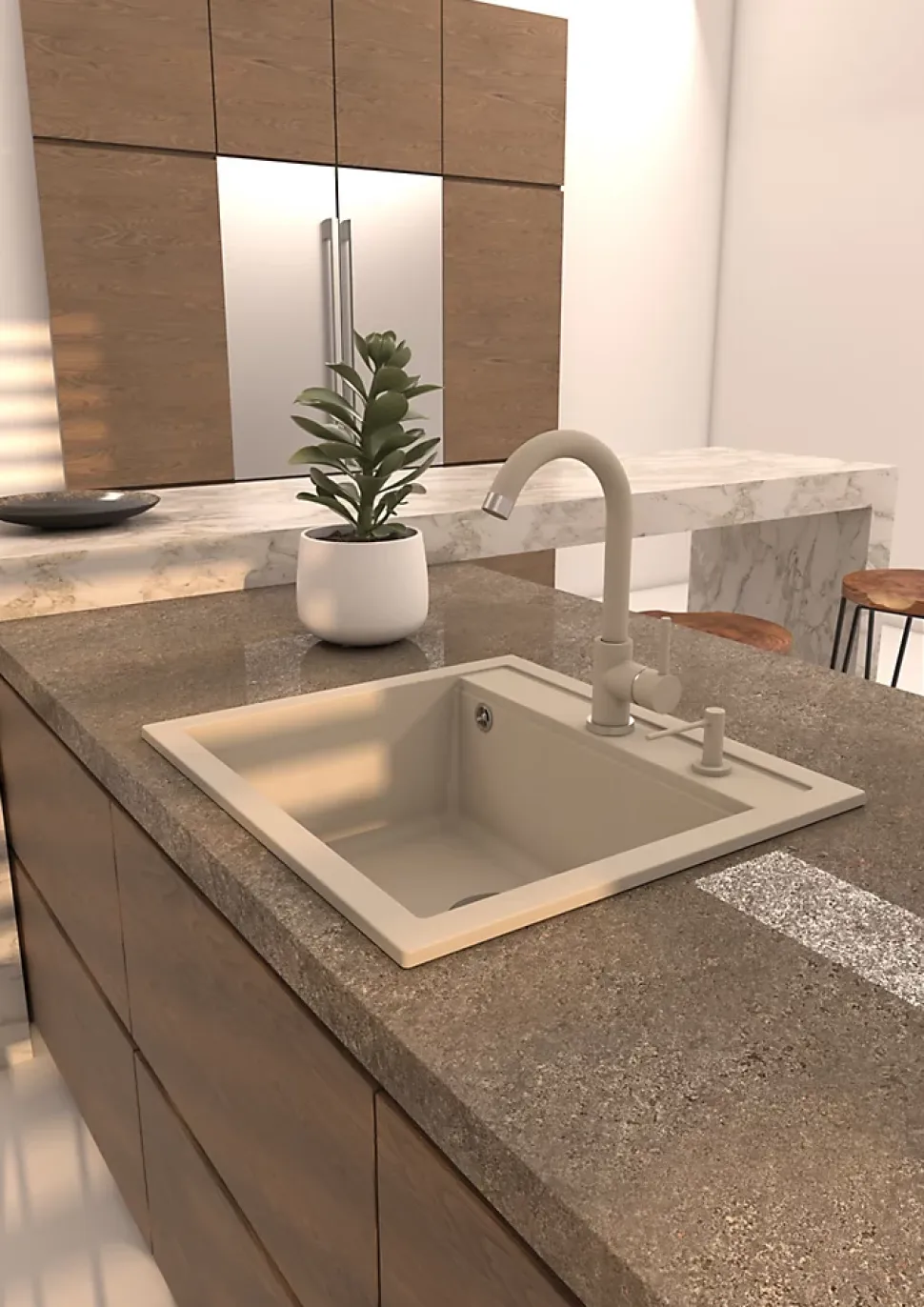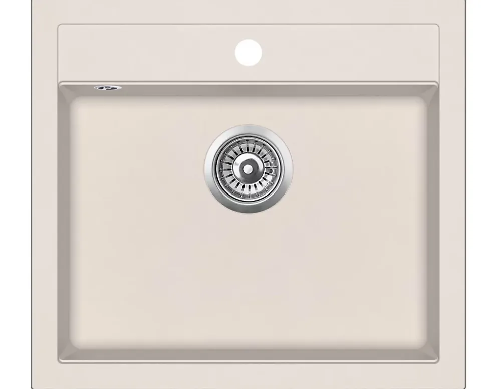 Evier au style moderne, épuré et chaleureux.Type d’évier : évier à encastrer, à cuve unique, de forme rectangulaire aux angles légèrement arrondis.Matériau et couleur : Granit de synthèse, de couleur beige sable / crème, ce qui lui donne un aspect doux et contemporain.Cet évier s’intègre harmonieusement dans une cuisine aux façades en bois et aux lignes minimalistes, renforçant une ambiance naturelle et haut de gamme.Evier à la fois fonctionnel, élégant et parfaitement adapté à une cuisine contemporaine.Evier 1 bac carré sans égouttoir. En granit SABLE. Dimension totale:565X510mm (bac:495x357x200). Fourni sans mitigeur avec vidage manuel. Granit: 80% quartz naturel, 20% résine). Pour un meuble sous évier de 60cm minimum. Garantie 15ans.