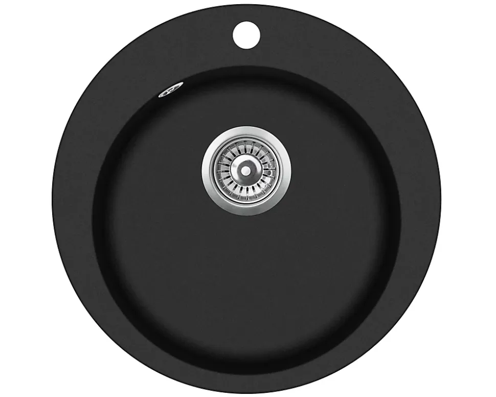 Évier de cuisine rond à encastrer, au design moderne et élégant. Fabriqué dans un matériau composite résistant, il offre une excellente durabilité face aux rayures, aux chocs et aux variations de température.Sa finition légèrement mouchetée apporte une touche chaleureuse et s’intègre facilement dans tous les styles de cuisine, classiques ou contemporains.Caractéristiques :Forme : rondeType : évier à encastrerMatériau : granit de synthèse Bonde en acier inoxydable inclusePerçage pour robinetEntretien facile et surface non poreuseIdéal pour une cuisine fonctionnelle et esthétique.Evier rond (dimensions totales 505×505) en granit NOIR. 1 bac de dimensions 395x3995x190. Fourni sans mitigeur avec bonde, siphon et vidage manuel. Granit 80% quartz, 20% acrylique). Pour meuble sous-évier de 45cm minimum. Garantie 15ans.